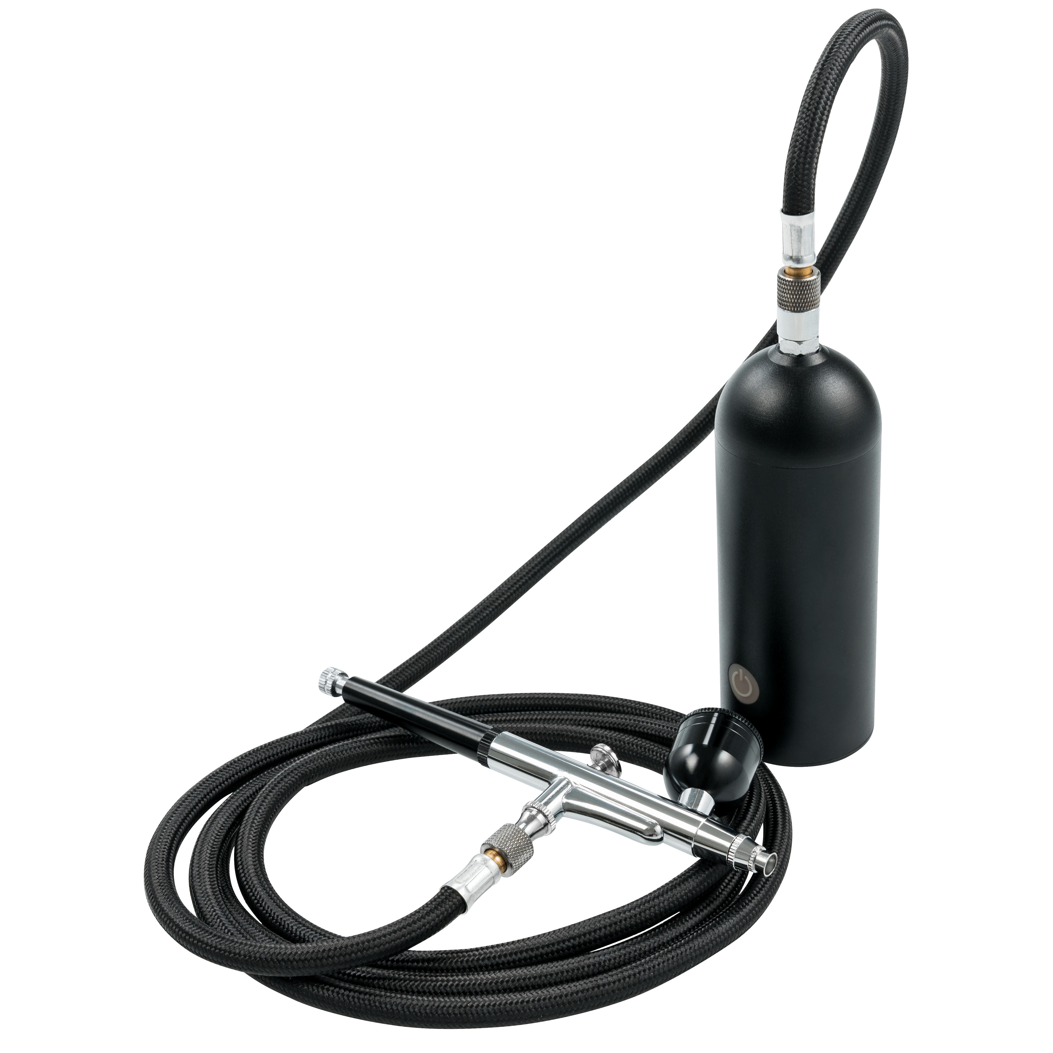 Die Airbrush-Pistole kann direkt auf den Kompressor geschraubt werden. Dieser wird dann in der Hand, ähnlich einer Farbsprühdose, gehalten. Der 180 cm lange Luftschlauch erlaubt es auch den Minikompressor abzustellen und nur mit der Airbrush-Pistole in der Hand zu arbeiten.