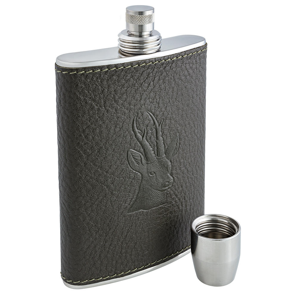 BEIER Flachmann mit Schraubbecher, 225 ml, oliv, Motiv Rehbock