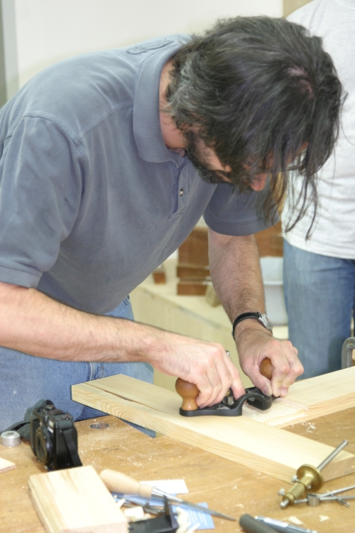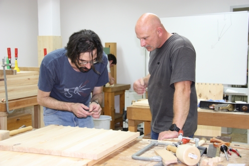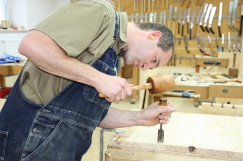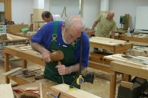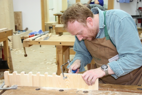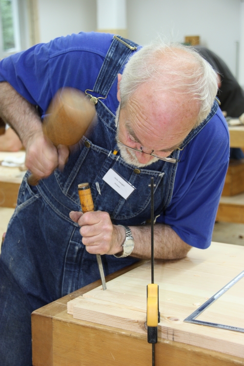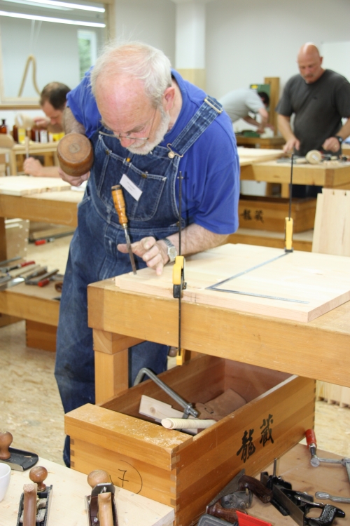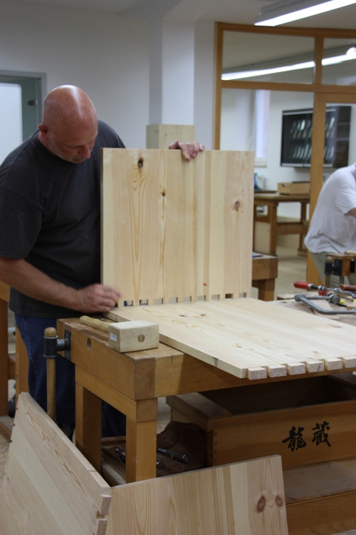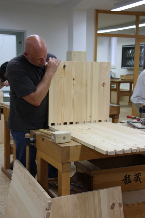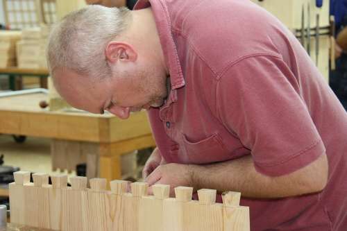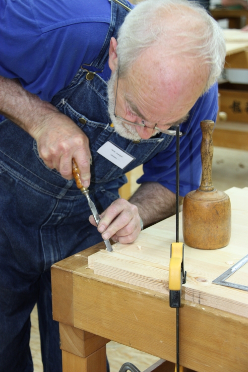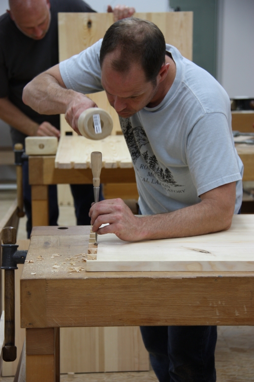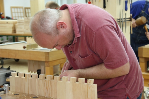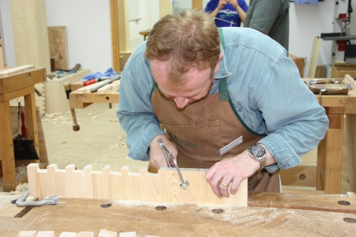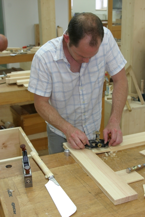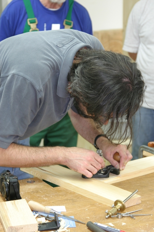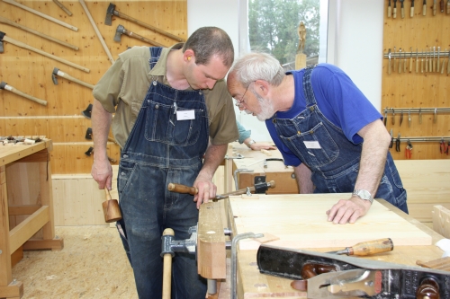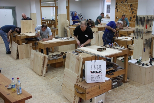 Ein ehrgeiziges Projekt hatte der zweite Kurs zum Inhalt: Jeder Teilnehmer baute innerhalb von 5 Tagen eine große, von Hand gezinkte Werkzeugkiste in traditioneller Form. Als frischgebackener Autor des Buchs „The Anarchist‘s Tool Chest“ setzt sich Chris Schwarz seit langem intensiv mit dem Thema „Klassische Werkzeugkisten“ auseinander und konnte den Teilnehmern nicht nur holzhandwerkliches Knowhow vermitteln, sondern auch die geschichtliche Entwicklung der Werkzeugkiste beleuchten. Am Ende des Kurses waren alle Teilnehmer stolz auf ihre selbstgebaute, stabile und handwerklich hervorragend gefertigte Werkzeugkiste, mit Sicherheit ein Unikat, über das sich auch noch weitere Generationen von Holzhandwerkern freuen werden.