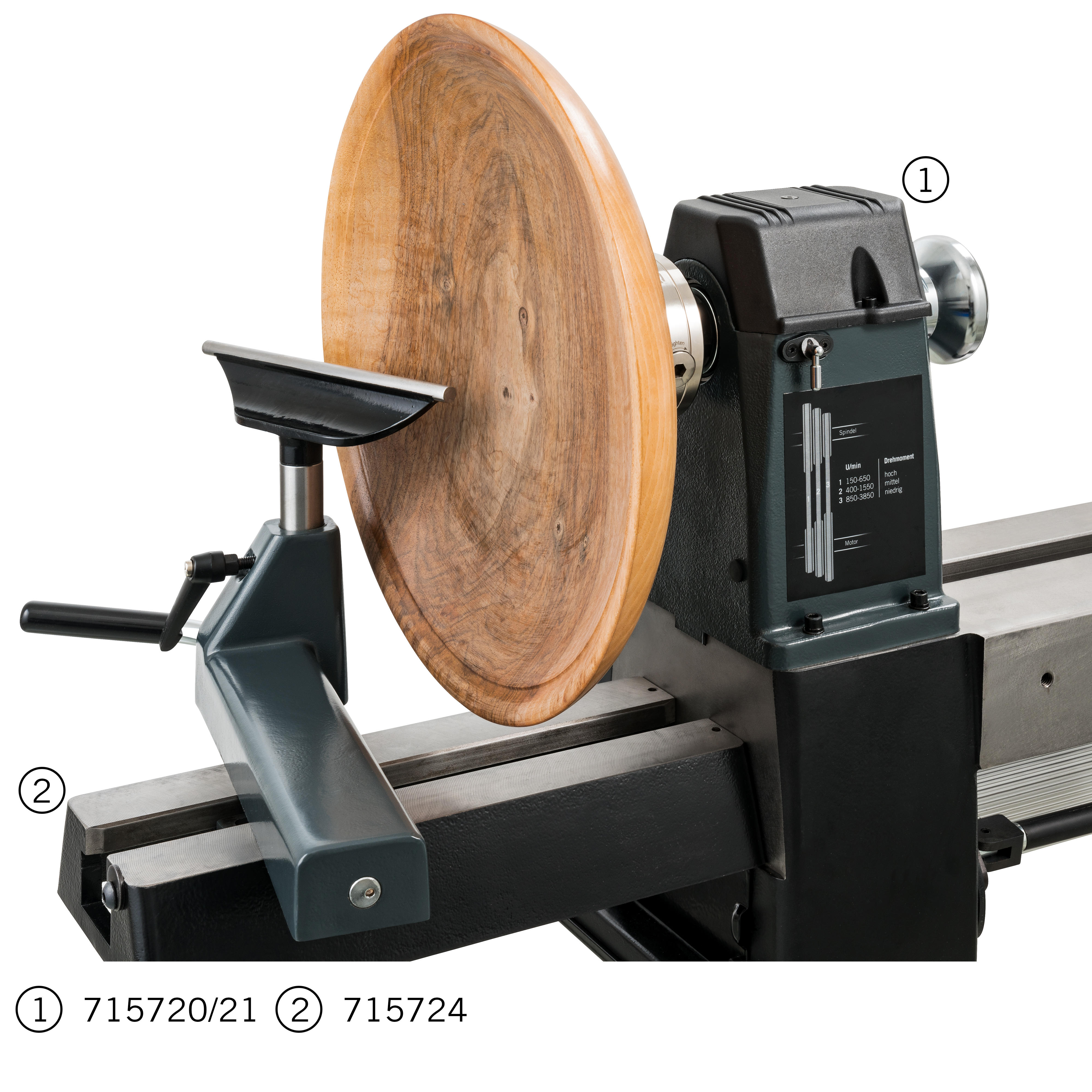 Die Spindel ist an beiden Seiten mit einem M33 x 3,5 DIN 800 Gewinde ausgestattet, um Spannfutter, Planscheiben etc. auch auf der linken Außenseite des Spindelstocks anzubringen. Dadurch lassen sich Werkstücke mit einem Durchmesser bis 460 mm bearbeiten, z. B. Teller oder Schalen.