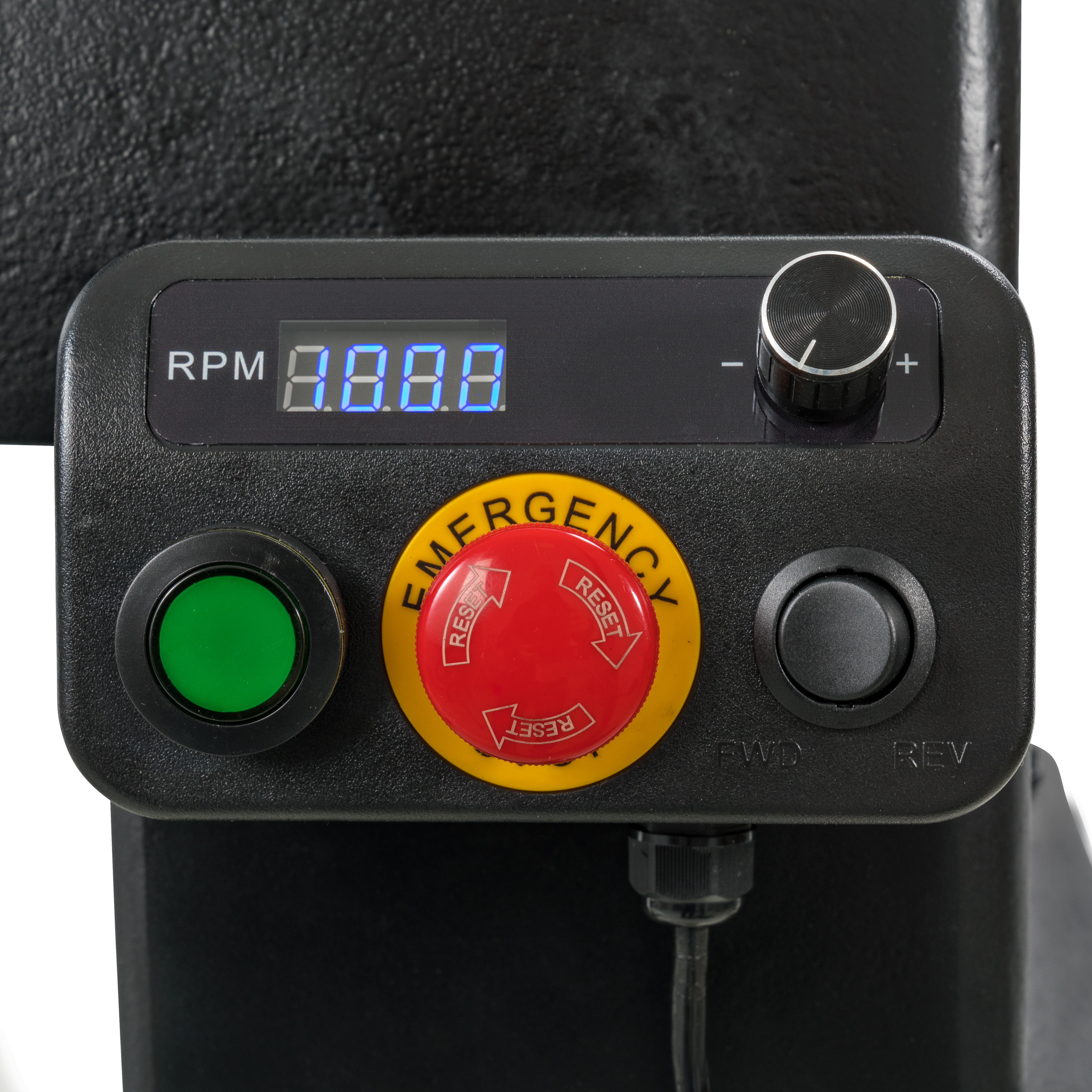 Die Bedienbox mit Ein-/Ausschalter, stufenloser Drehzahlverstellung durch Drehregler, LED-Drehzahlanzeige von 150 - 3850 U/min. und Wendeschalter für Links- /Rechtslauf ist durch den Magnetboden überall und bequem erreichbar an der Maschine anzuheften.
