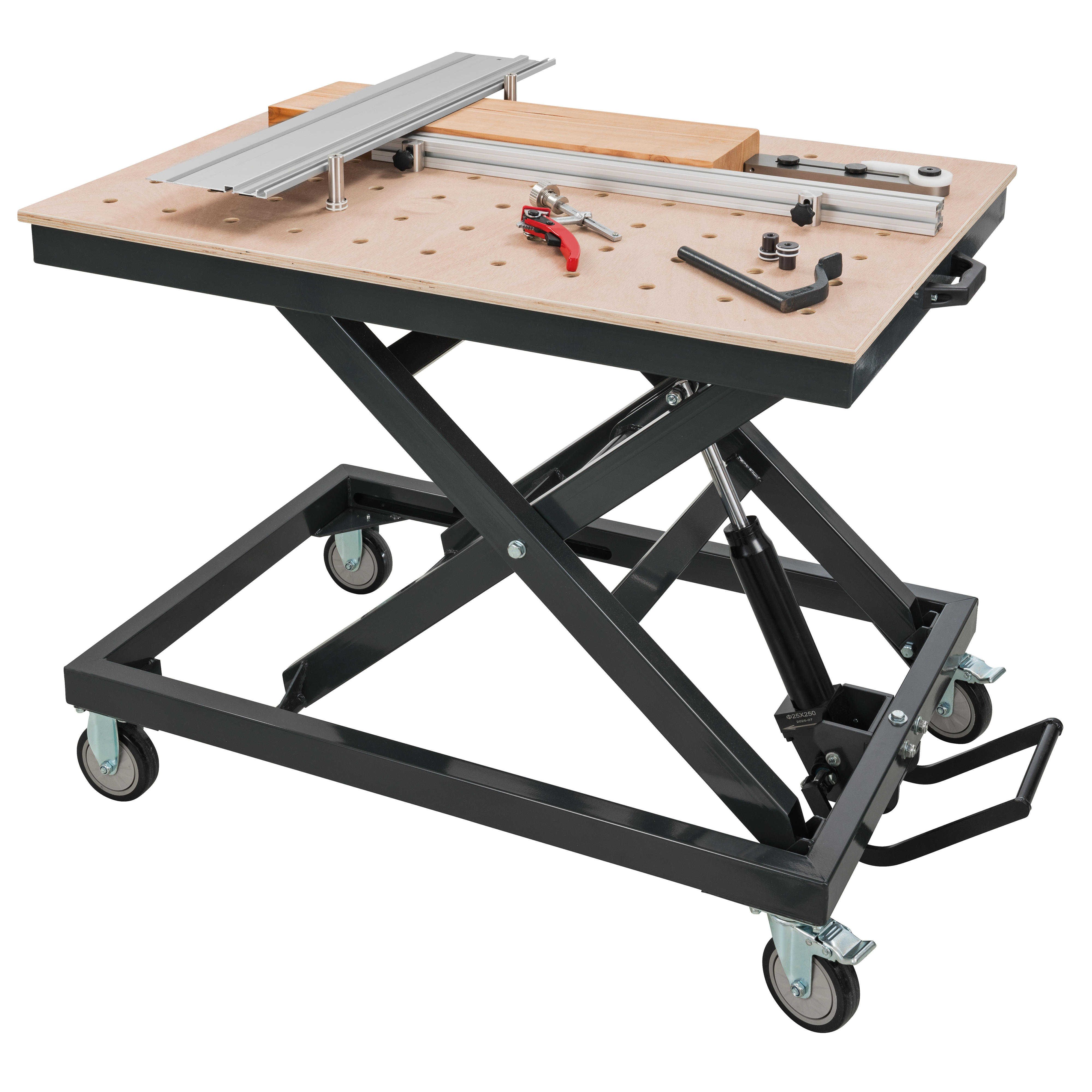 Der Rahmen hat eine Abmessung von 1100 x 700 mm und ist für eine maximale Belastung von 350 kg ausgelegt. Dadurch eignet sich der Hubtisch sowohl für Holzbearbeitungsprojekte als auch für allgemeine Montage-, Service- oder Transportaufgaben.