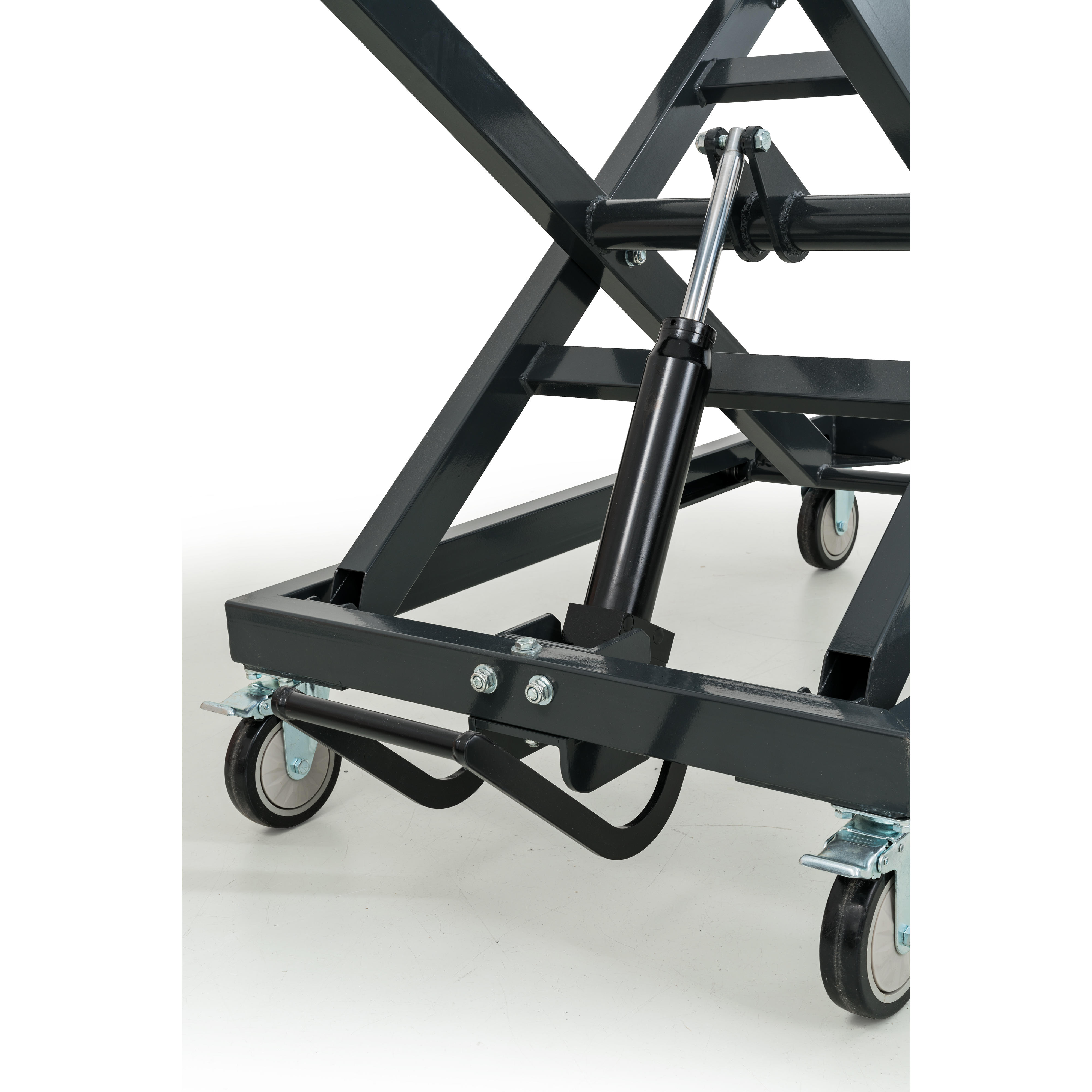 Die Höhenverstellung erfolgt über einen Hydraulikzylinder mit Fußpedal. Das Absenken der Plattform erfolgt ebenfalls über den Fußhebel des Hydrauliksystems. Der Höhenbereich erstreckt sich von 430 mm bis maximal 1040 mm (zzgl. Platte).