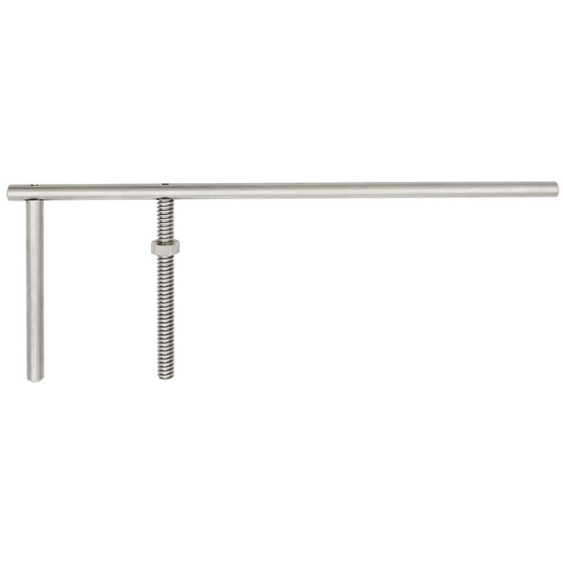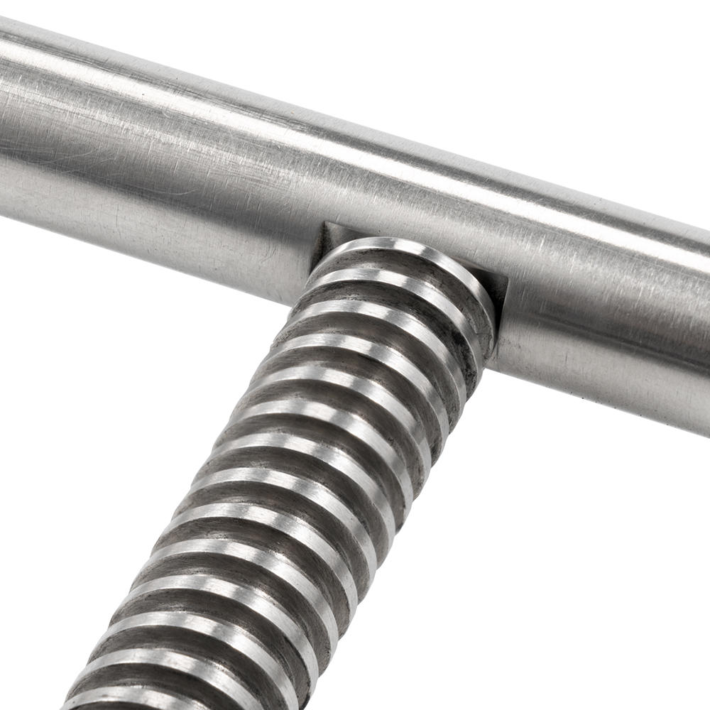 Der Stützarm wird aus einzelnen Edelstahl-Elementen verschraubt. Dadurch ergeben sich exakte 90°-Winkel und gerade Führungsstangen. (Hinweis: beim Verschweißen oder Biegen der Elemente würden sich diese verziehen -Materialverzug beim Schweißen und Rückfederung beim Umformen/Biegen).