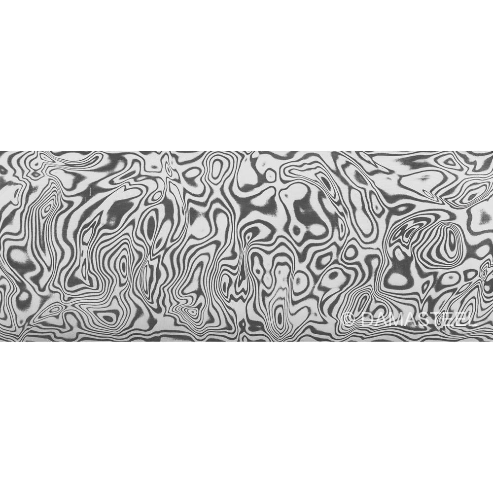 DS93X is a powder metallurgy Damascus steel. It is made from two different hardenable steel grades (RWL34 and PMC27). The two alloys are fused on smelting in more than 100 layers with no transition band and can therefore be regarded as a solid piece of steel before further processing. Further processing (creation of the pattern) is carried out in the same way as in traditional Damascus steel production. Soft annealed for easy processing. The steel becomes stainless after heat treatment. Hardenable up to 64 HRC.