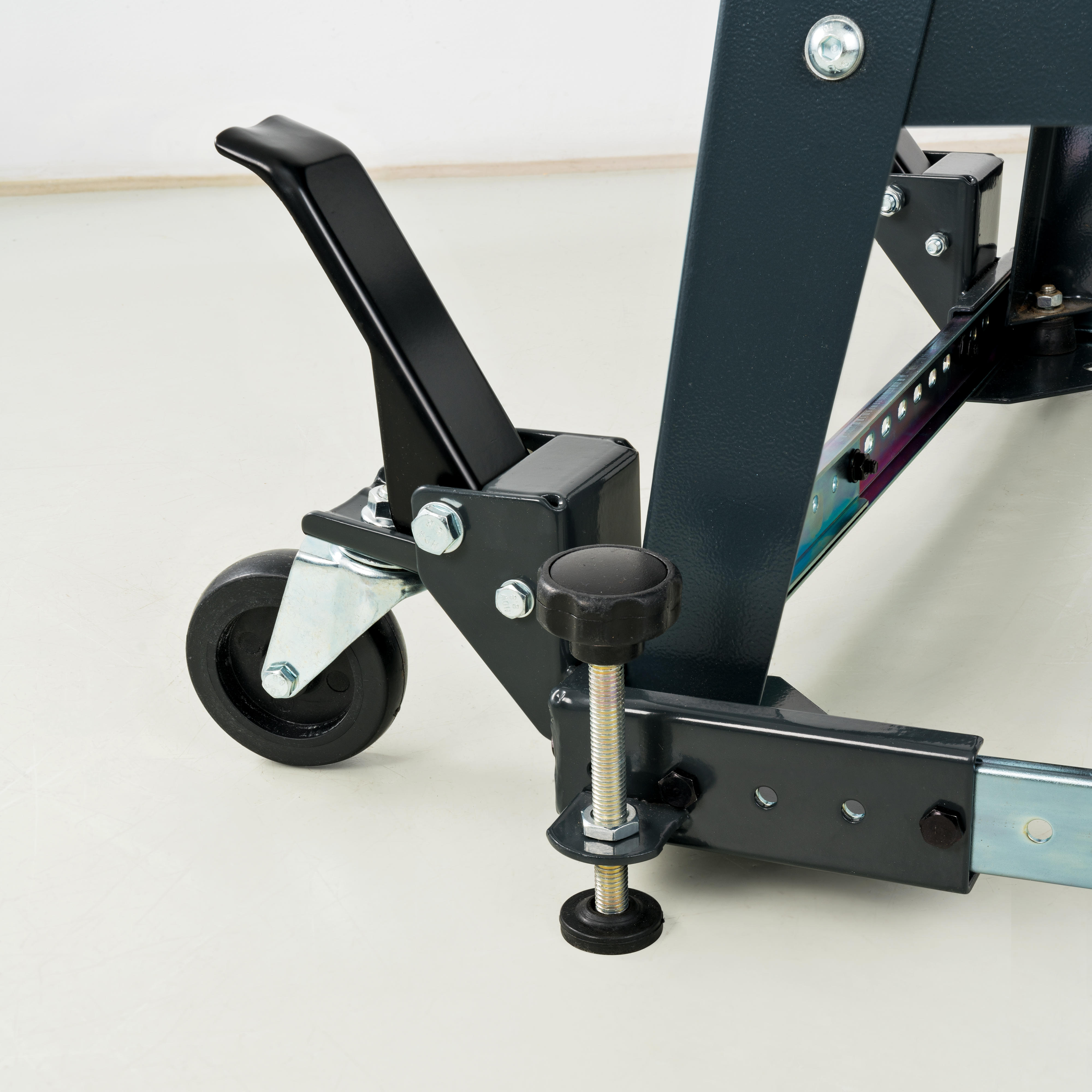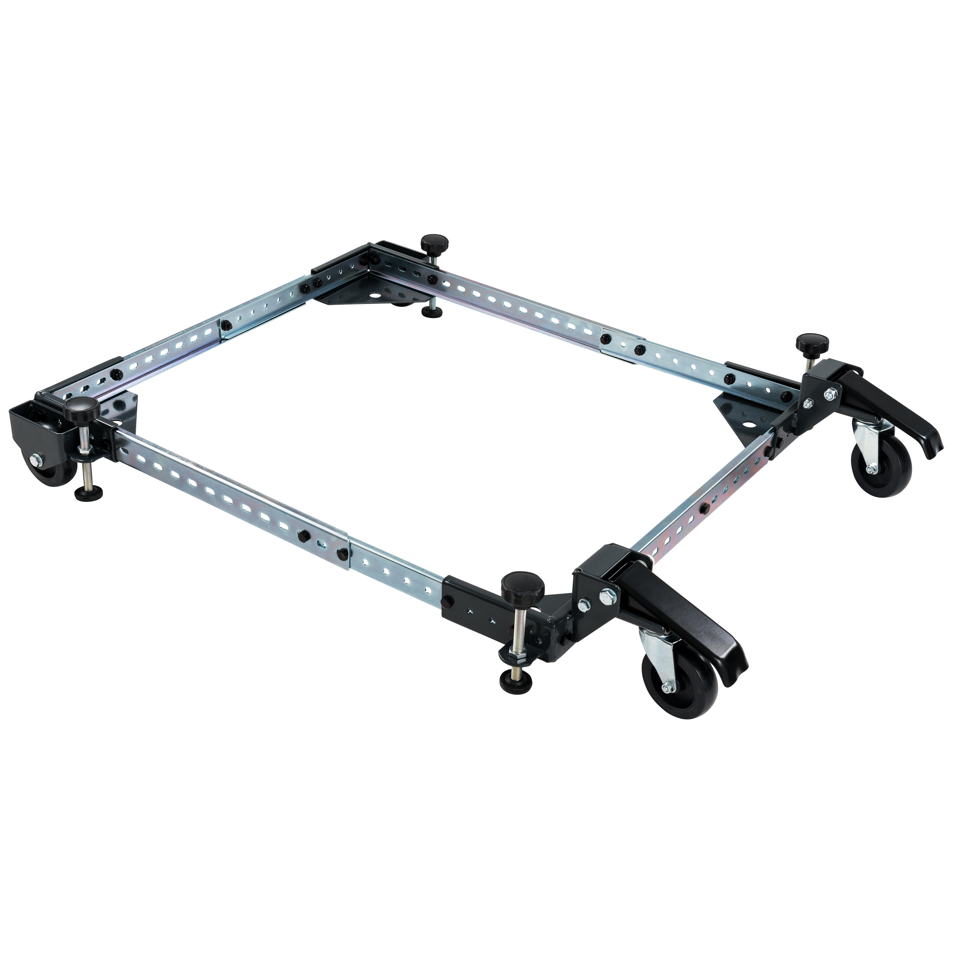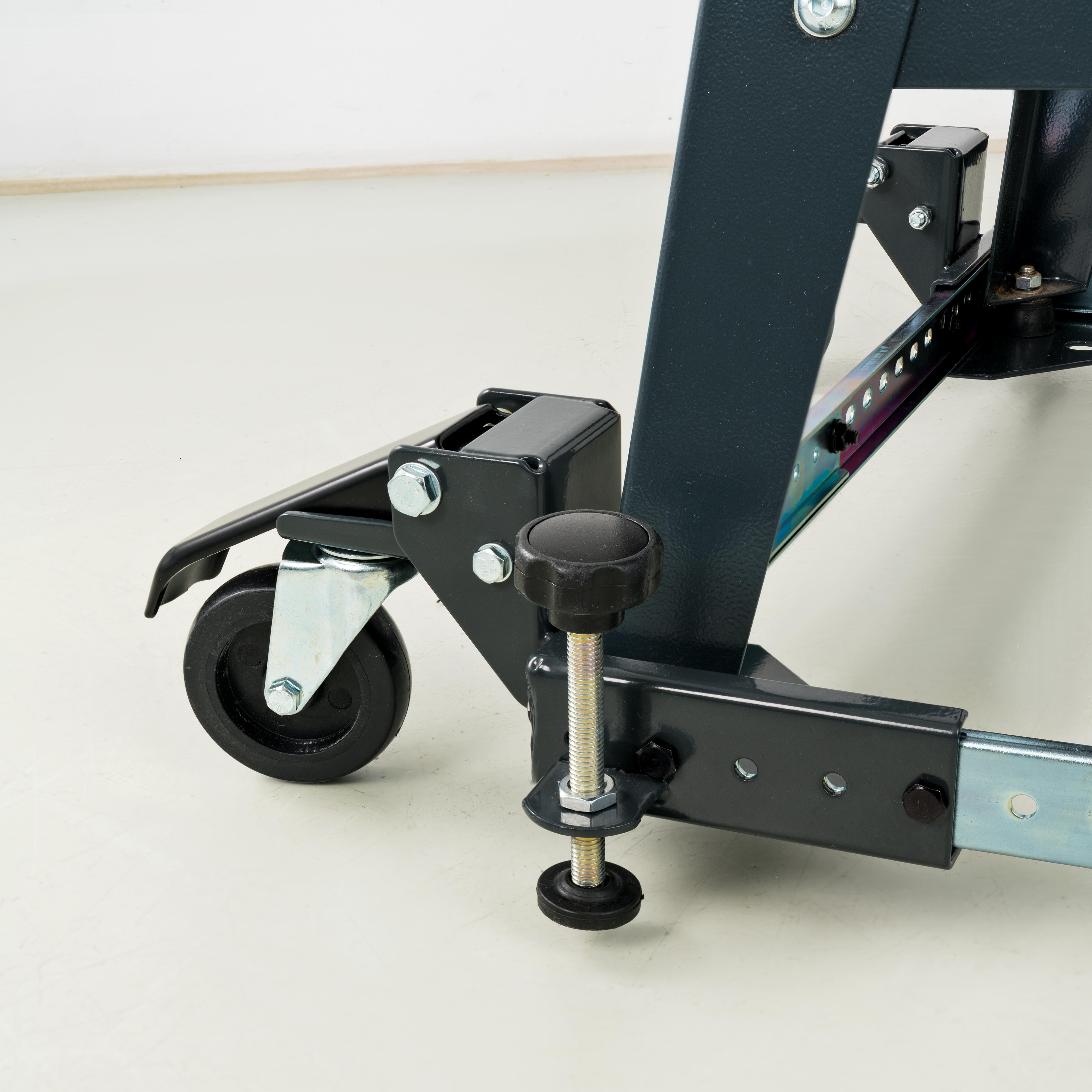 The adjustable frame is reinforced by corner brackets, two fixed castors and two 360° swivelling castors. The castors are made of hard-wearing, floor-friendly polyurethane, helping to prevent scratches and unwanted movement on workshop floors. To move the platform, the two foot pedals are pressed down, lifting the rear levelling feet and engaging the swivelling castors. Raising the foot pedals lowers the platform again. The four levelling feet allow the stand and mounted machine to be precisely levelled.