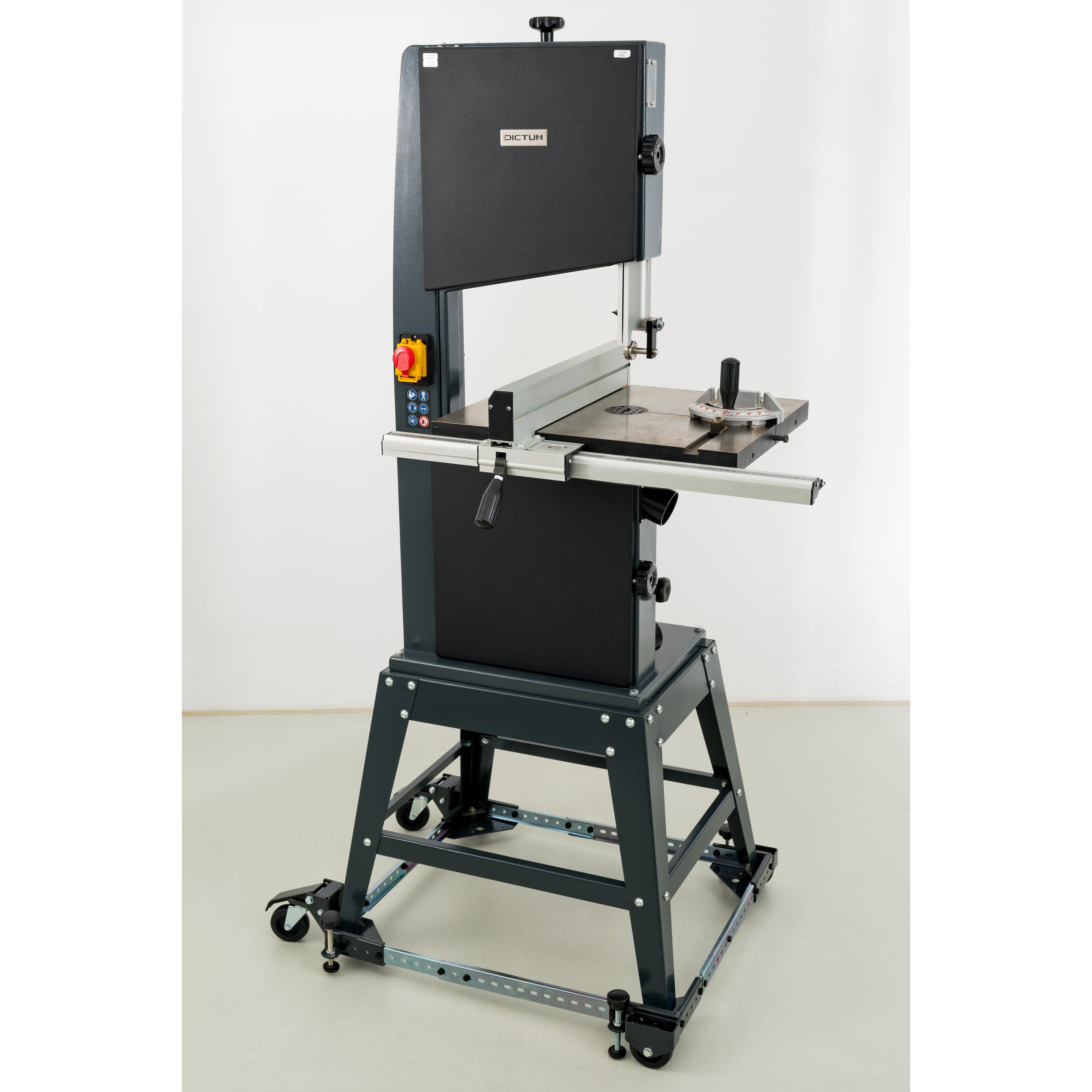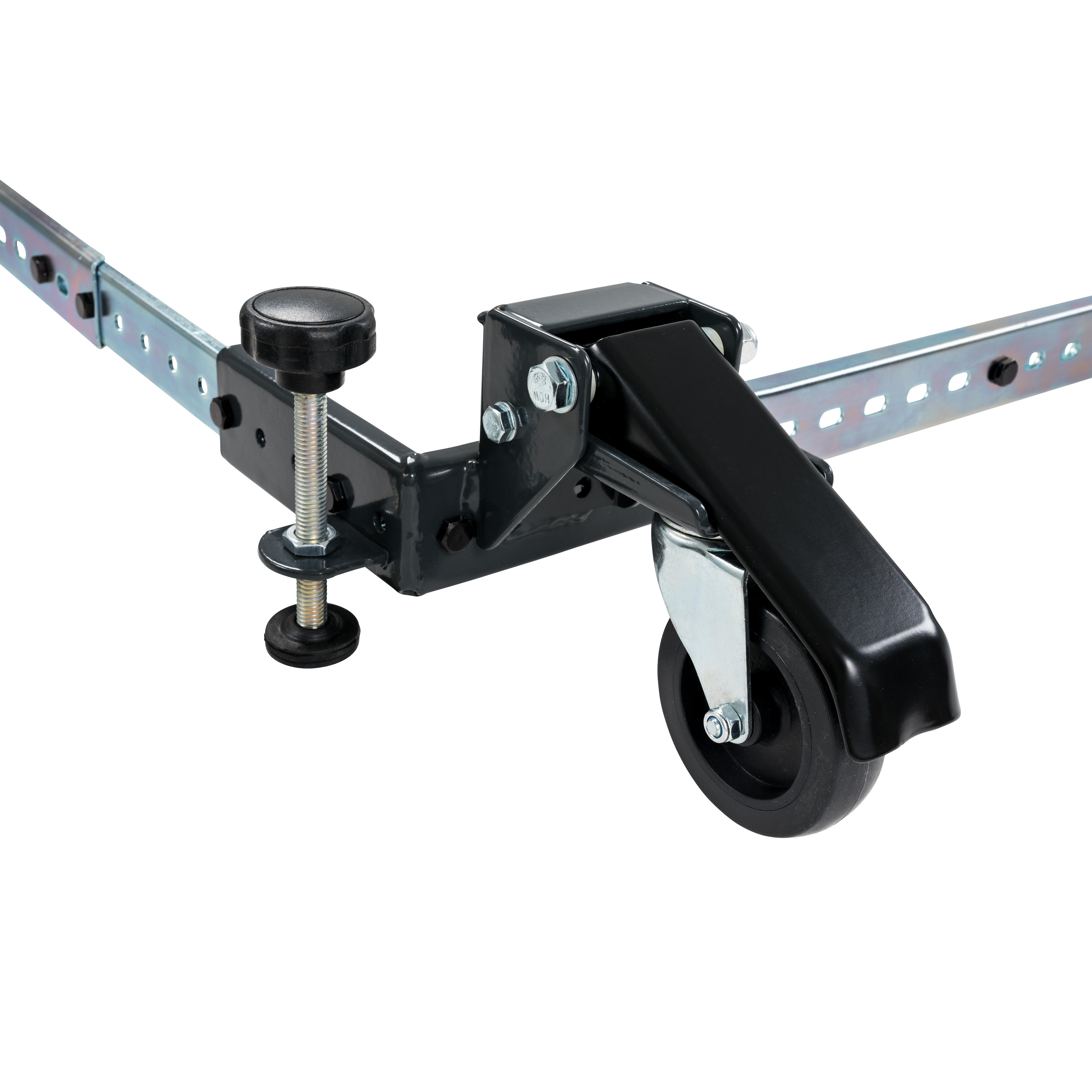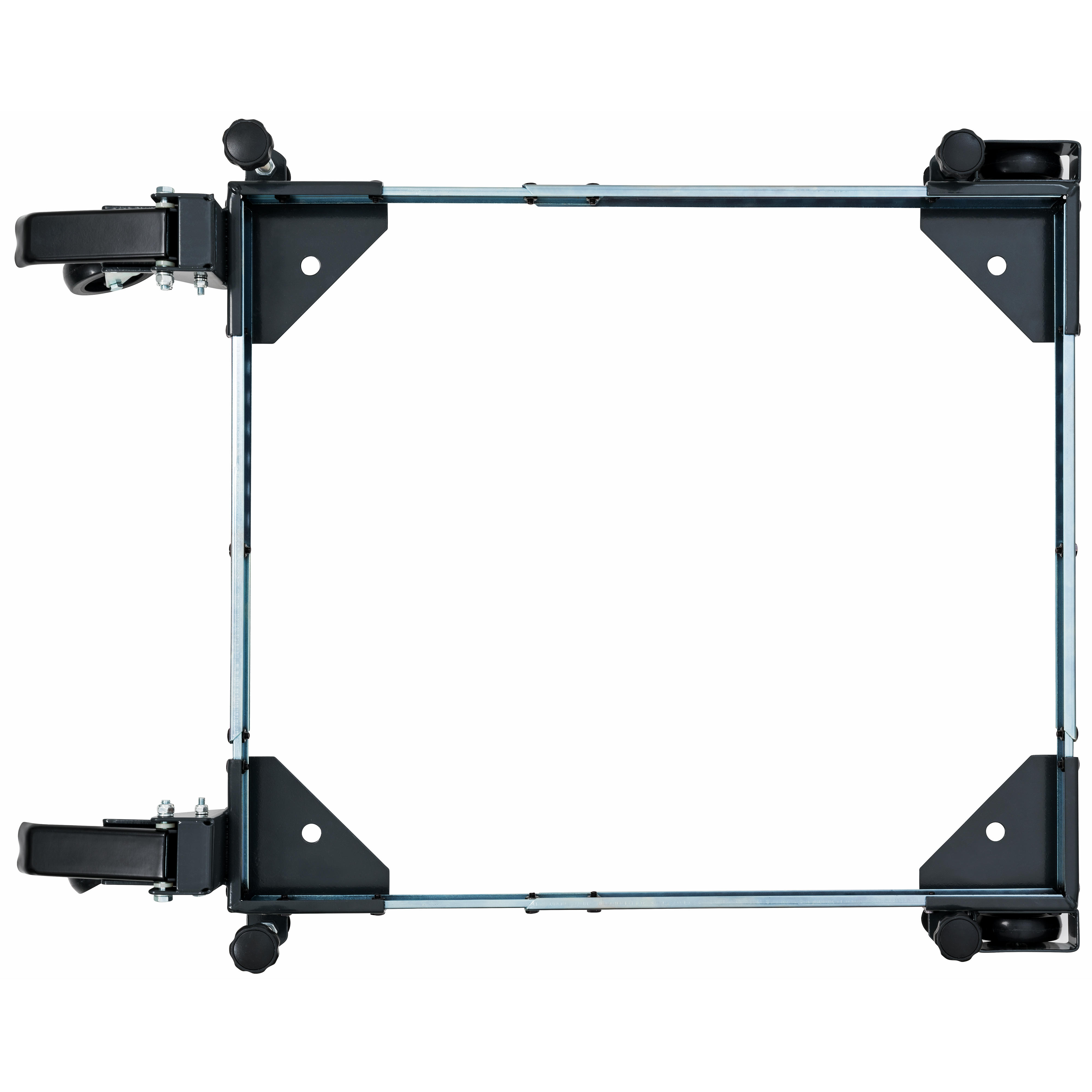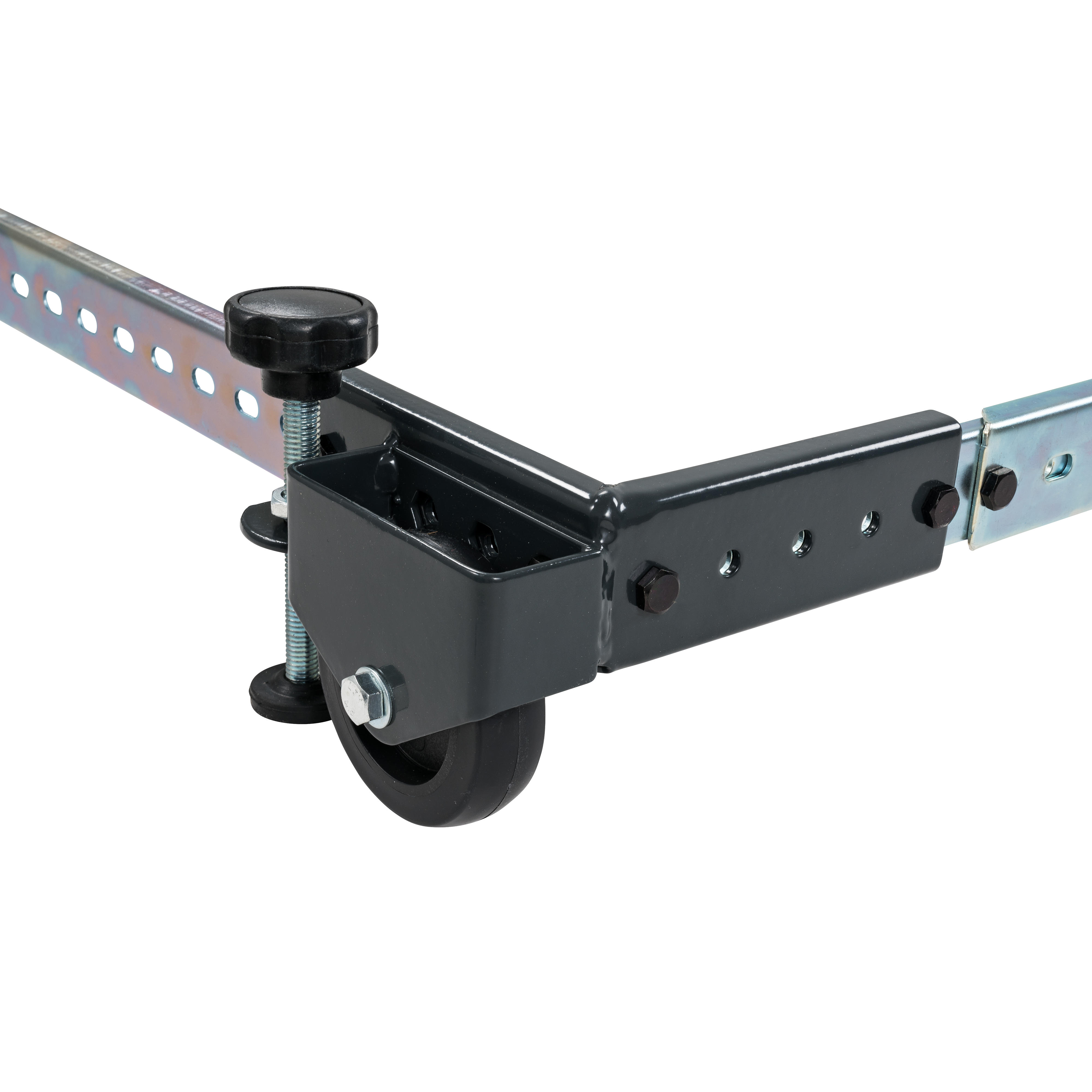 The adjustable frame is reinforced by corner brackets, two fixed castors and two 360° swivelling castors. The castors are made of hard-wearing, floor-friendly polyurethane, helping to prevent scratches and unwanted movement on workshop floors. To move the platform, the two foot pedals are pressed down, lifting the rear levelling feet and engaging the swivelling castors. Raising the foot pedals lowers the platform again. The four levelling feet allow the stand and mounted machine to be precisely levelled.