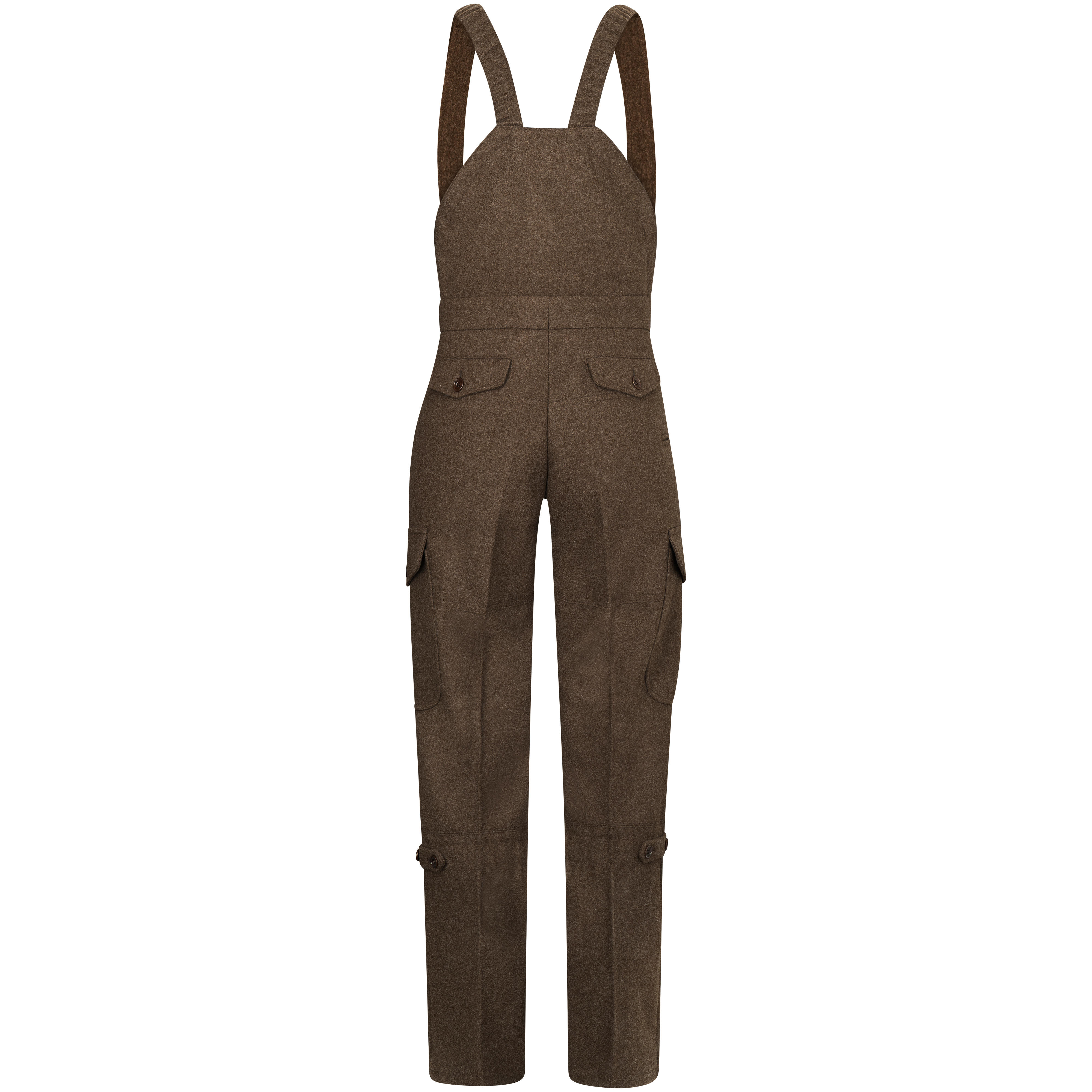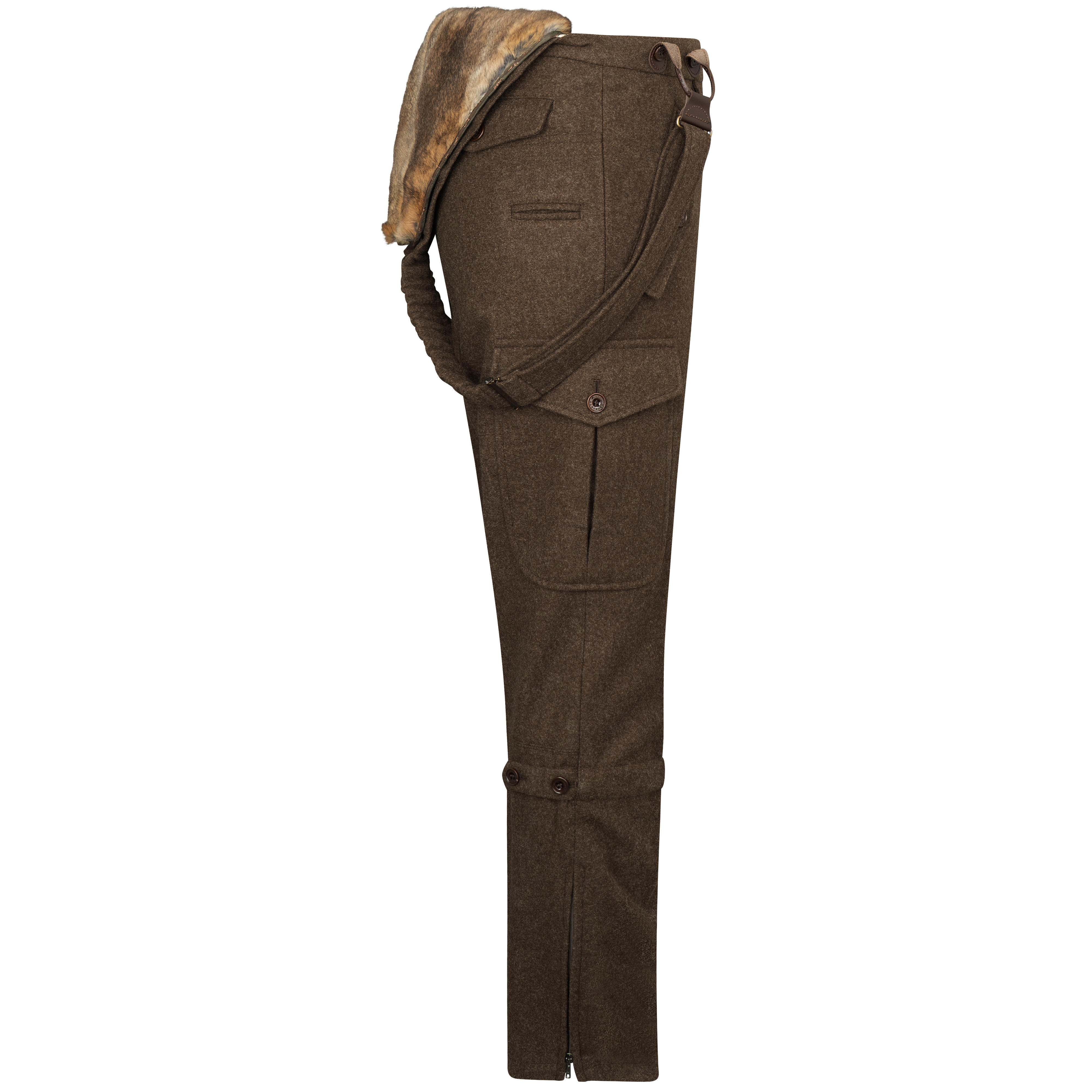 The trousers feature bib-style braces that attach at the front using adjustable leather loops and can be individually lengthened. The lower leg width can be adjusted from the knee down using a concealed zip, allowing for a secure fit over any boot.