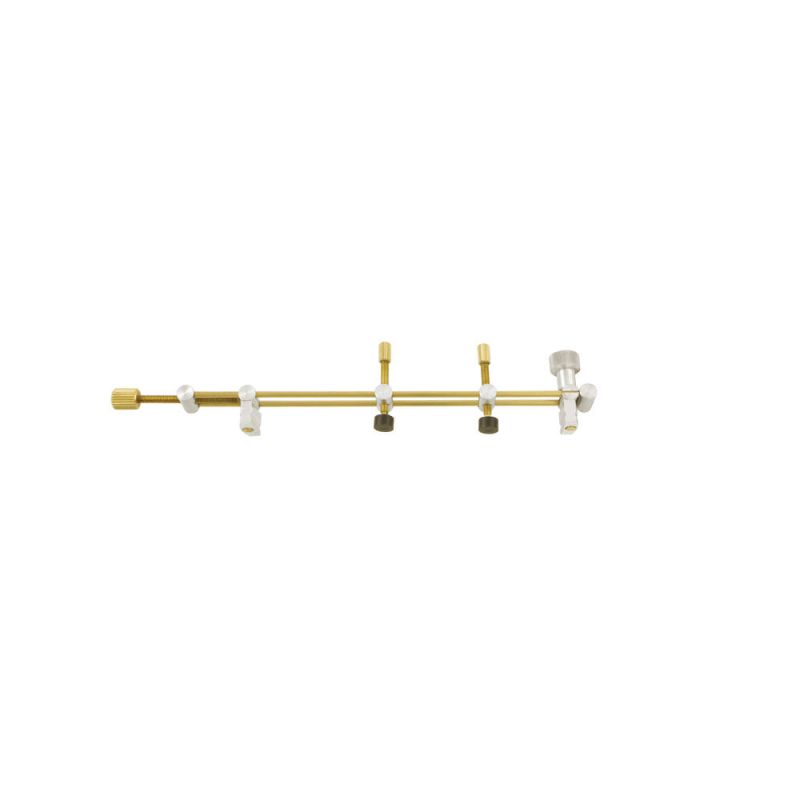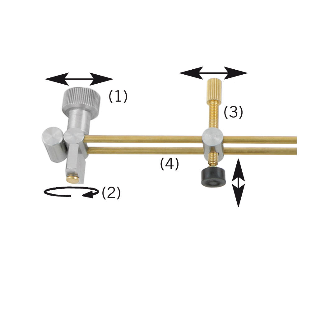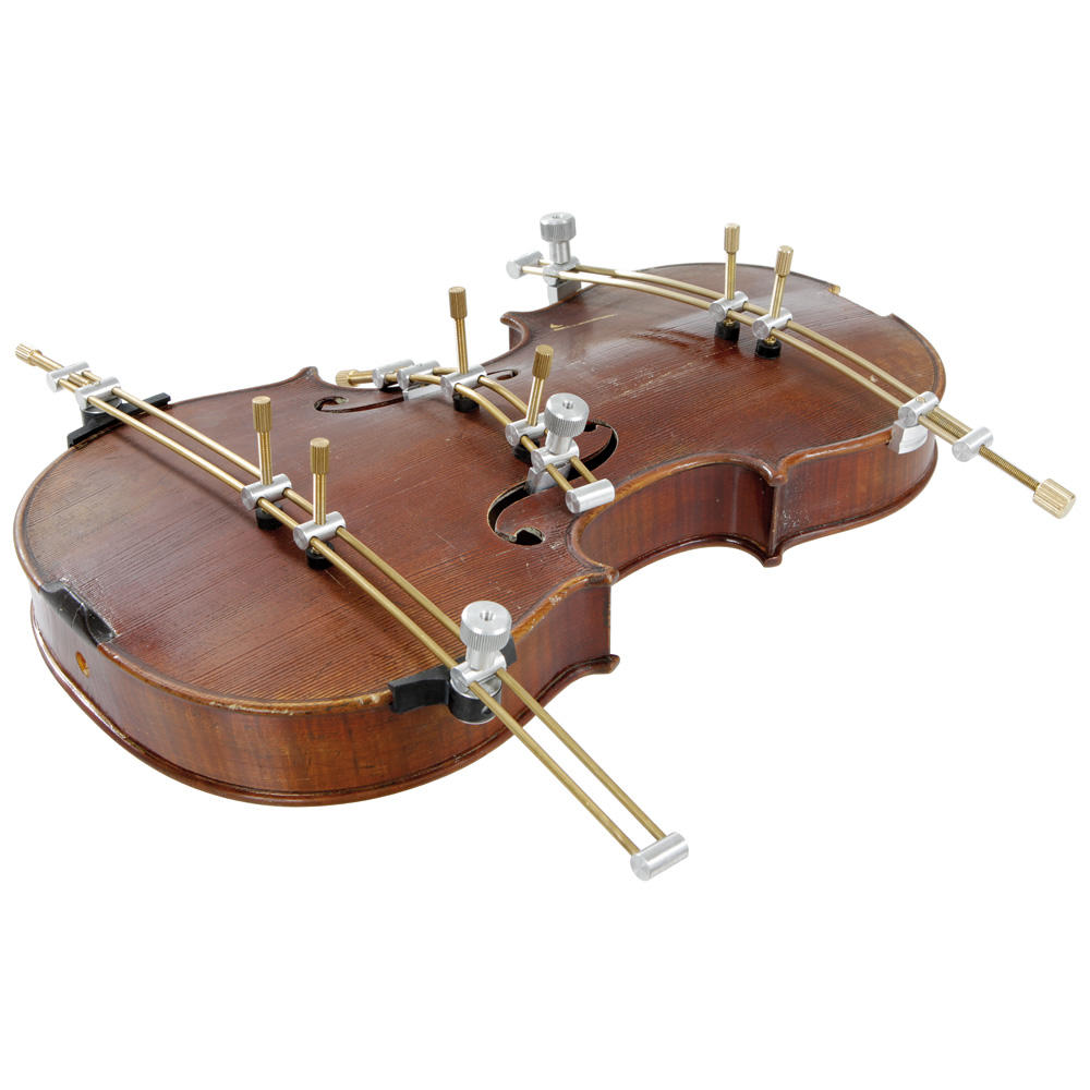 The movable clamping jaw (1) can be easily set to the desired length. The clamping pad (2) is concave on one side and convex on the other and pivots to accommodate the exact contours of the instrument. The sliding jack screws (3) allow the crack to be leveled without the use of additional wedges. The double brass rods (4) are flexible and can be shaped to conform to the curvature of the instrument being restored. Brass jack screws with rubber padded plates. Clamping pads and thumbscrews made of aluminium.