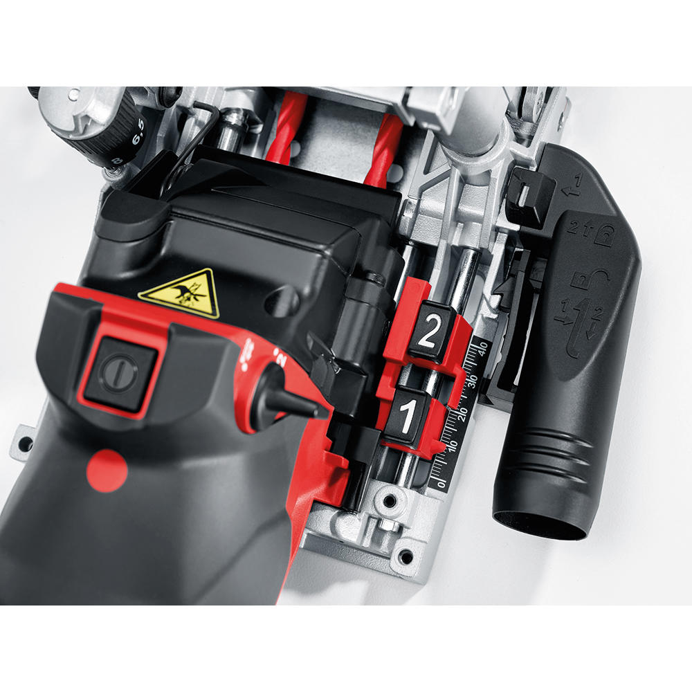 - Two depth stops allow to set two drilling depths. They are preselected via a rotary knob. In addition, the rotary knob offers a setting for tool change, which automatically blocks the on-switch.