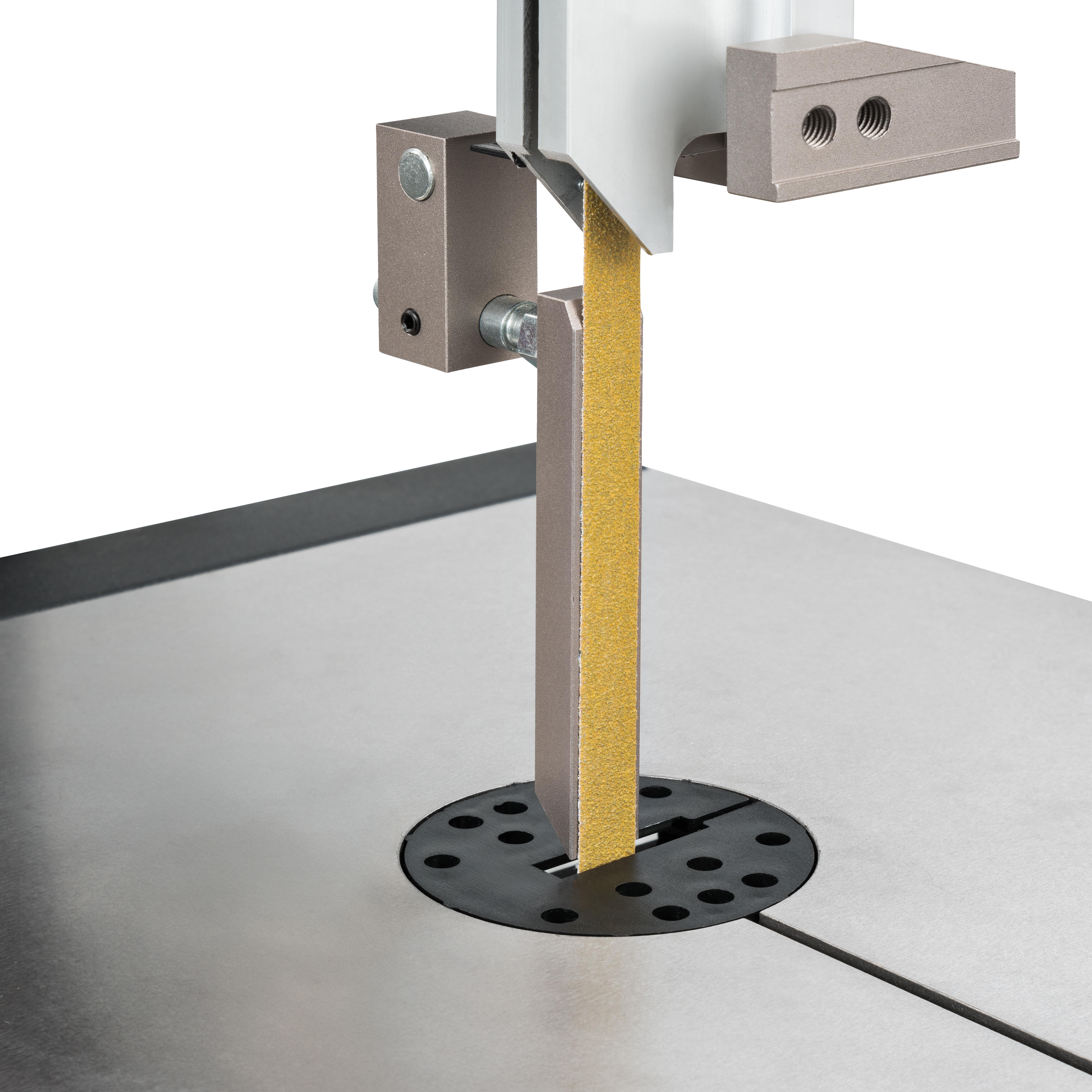 Belt sander: The optional DICTUM sanding belt guide No. 714784 transforms the SRP10 DUAL into a fully functional belt sander. The narrow sanding belts are ideal for fine work on tight curves and corners. Thanks to the specially designed mounting saddle (adapter bracket No. 801056 required), the sanding belt guide can be attached to the Pégas SRP10 DUAL and used in combination with both bandsaw guiding systems.