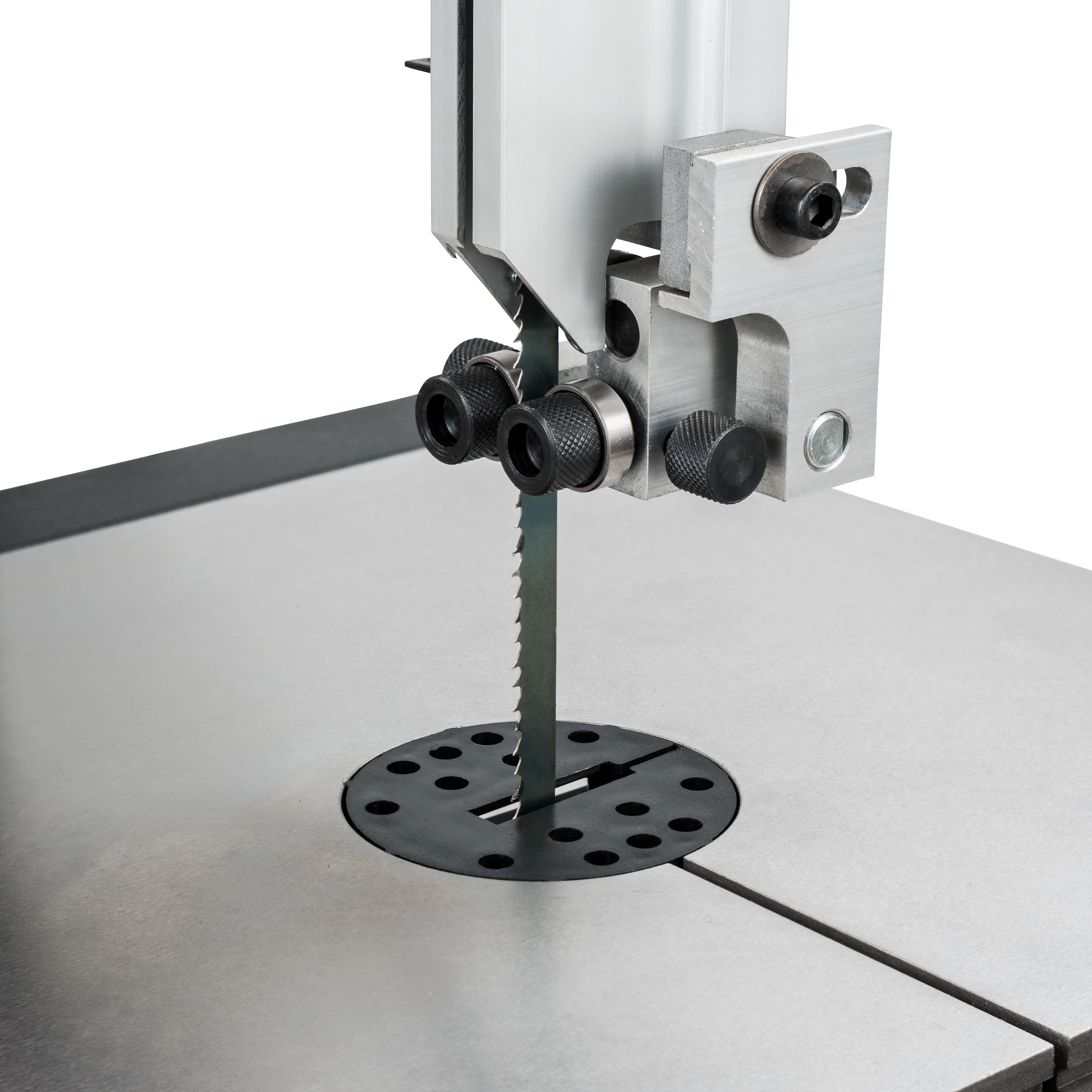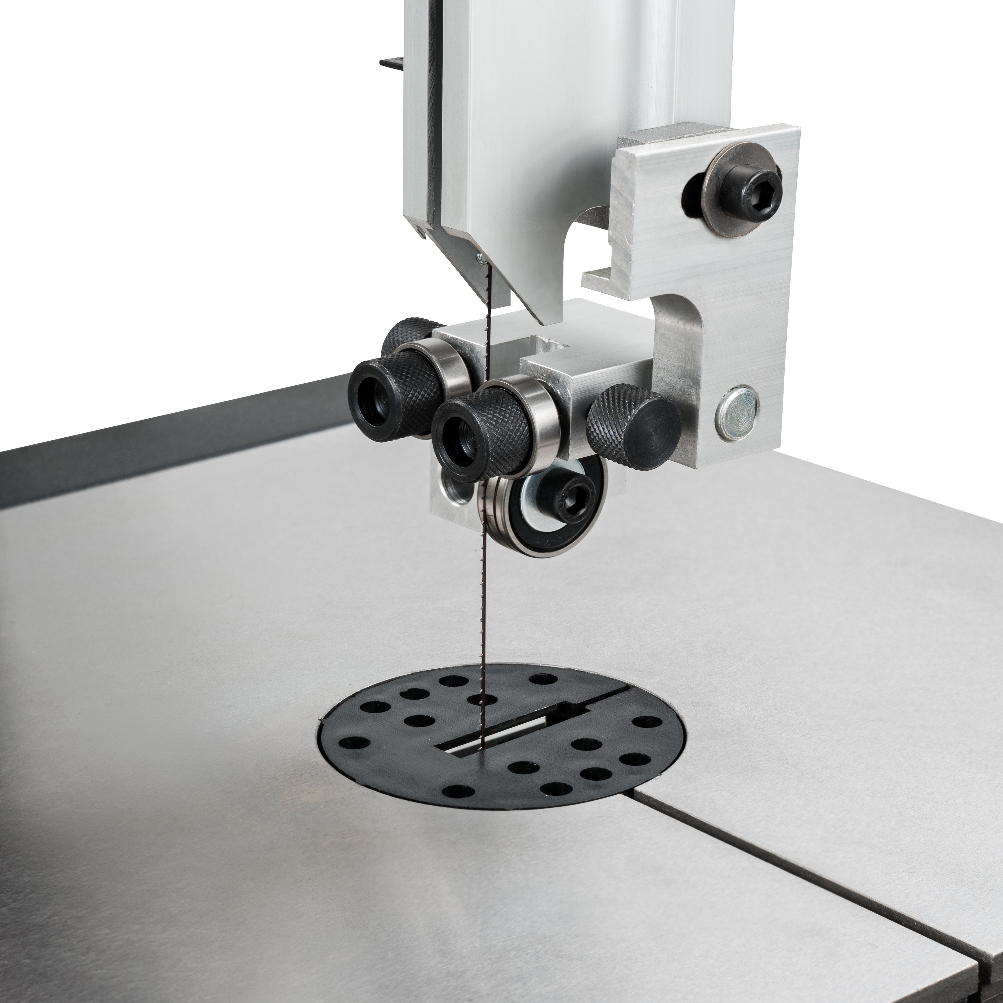Standard bandsaw: When converted and equipped with the included standard blade guide, blades ranging from 6 to 13 mm in width can be used. The wider and sturdier saw blades facilitate rougher cutting tasks, rip cuts, and straight kerfs. The machine offers all the features typically expected from a bandsaw. The solid cast iron table can be tilted from -5° to +45° and contains a 19 mm T-slot for guiding the supplied mitre gauge (-60° to +60°). The rip fence made of aluminium profile includes an integrated magnifying glass for easier reading of the mm/inch scale.