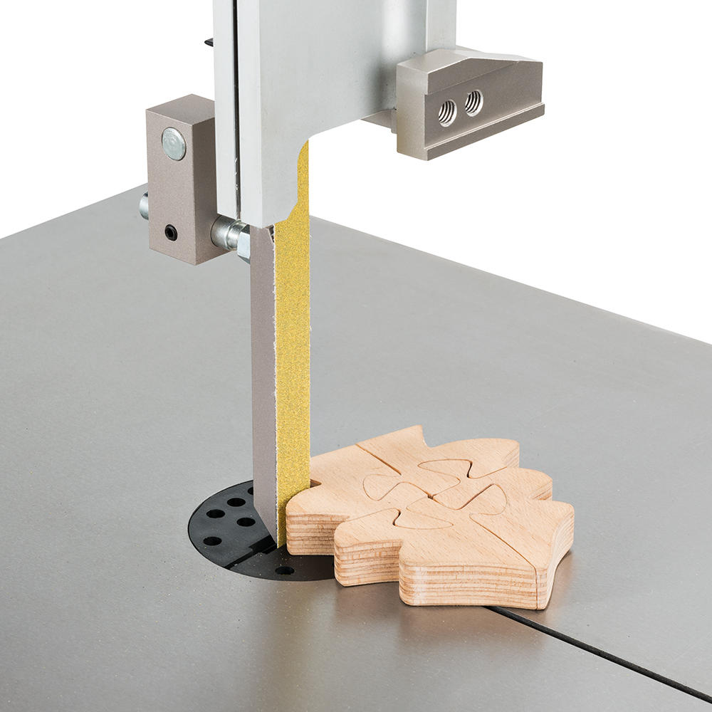 Scroll bandsaw: Equipped with the world’s finest and most precise saw blades, this bandsaw enables intricate woodworking, comparable only to what is typically achieved with scroll saws. The specially developed precision guiding system features roller bearings with guide grooves tailored to the respective scroll bandsaw blade. This ensures that the ultra-thin scroll bandsaw blades, ranging from 1.02 to 3 mm in width, are perfectly guided, prevented from twisting, and capable of performing the most delicate cuts, even for complex shapes and tight radii of less than 2 mm.
