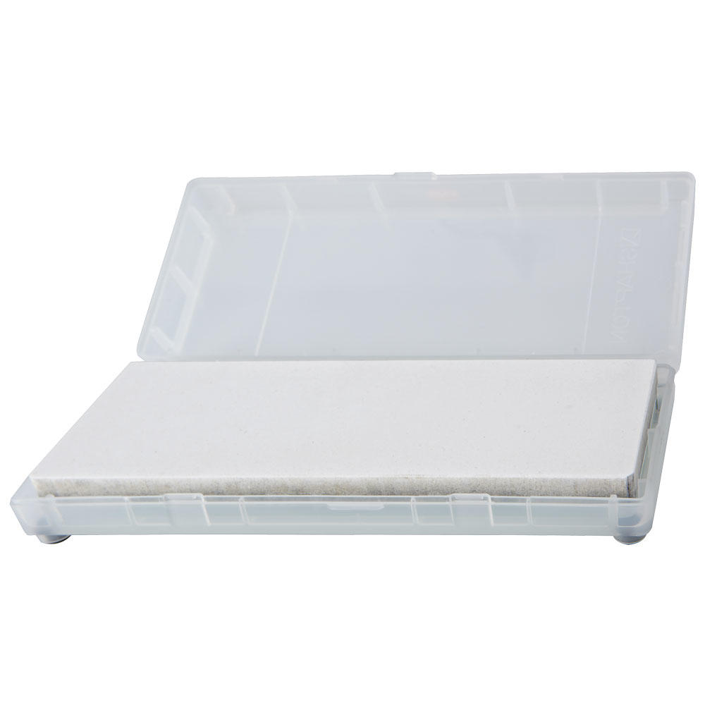 Another advantage of the glass base is that the grit rating on the underside is always visible even after much use. Before use, spray the stones with water. It is not recommended to keep them in water permanently. White aluminium oxide abrasive.