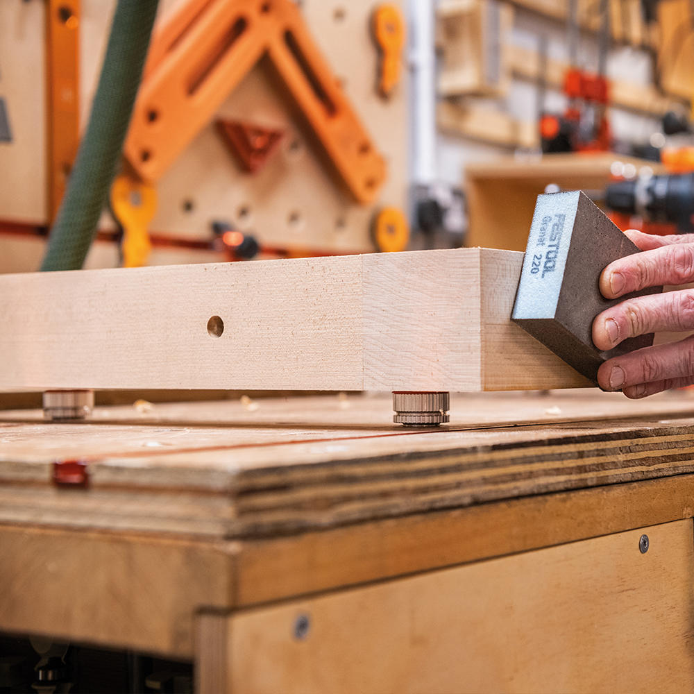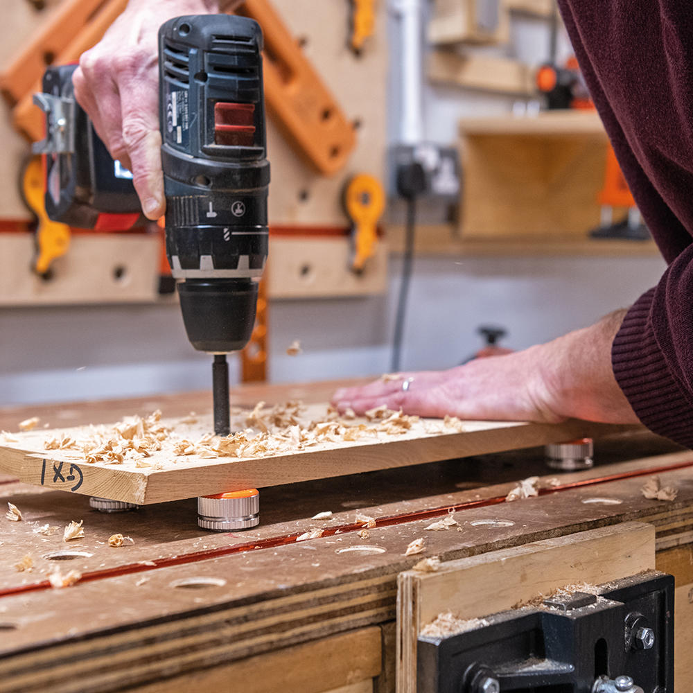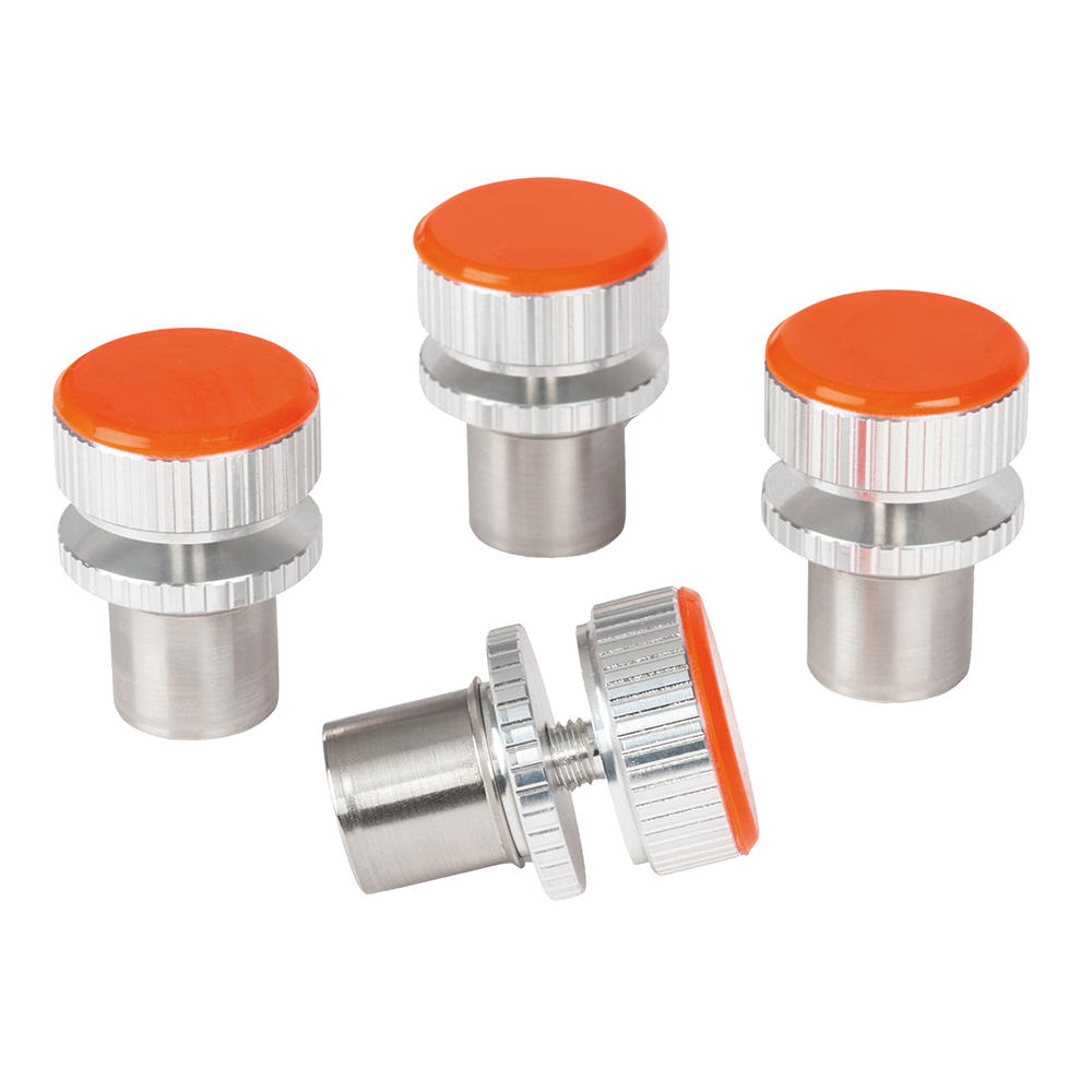 The 30 mm diameter anti-slip supports hold the workpiece in place. They are height-adjustable and lockable. This allows uneven workpieces to be levelled for machining. The 20 mm pin fits into the hole pattern of the multifunctional tables. Note: the edge of the hole must be chamfered, e.g. with UJK Parf Chamfer Tool No. 720654, so that the pin of the workpiece supports can rest on it. Each support is individually adjustable. Height adjustable from 20 to 29 mm.