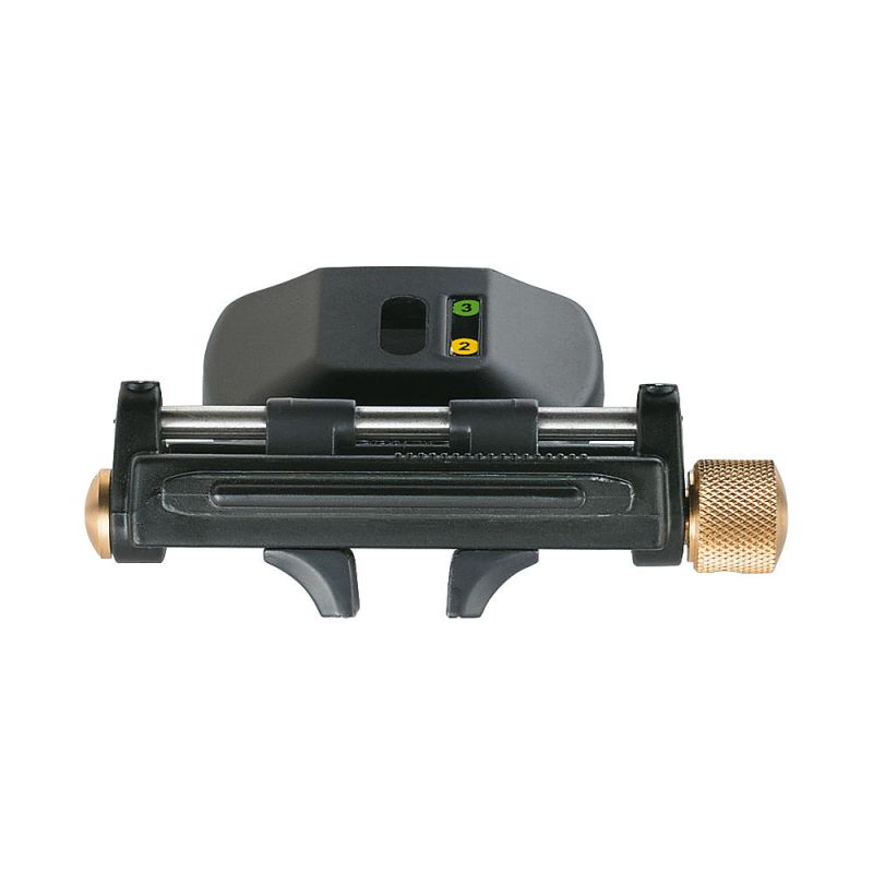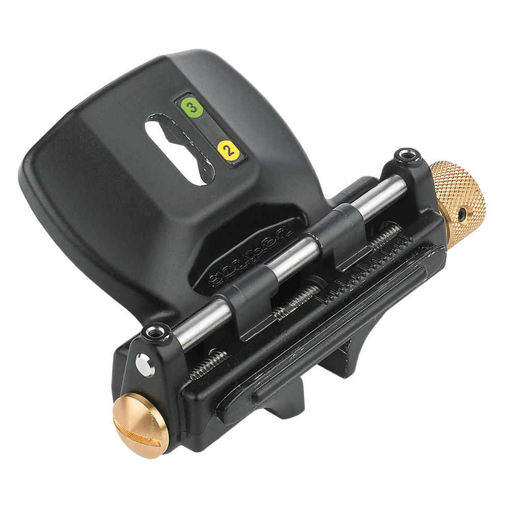 703666) à un guide à deux mâchoires à auto centrage. Simplement remplacez la bague de serrage standard par le serrage á deux mâchoires, c’est tout. Un accessoire de serrage à deux mâchoires permet d´affûter exactement et vite même les bédanes, ciseaux et fers de rabot les plus étroits en conservant précisément un angle de 90°. Également adapté pour des fers japonais courts. L'accessoire est un ajout pour le système d'affûtage II de Veritas (N°