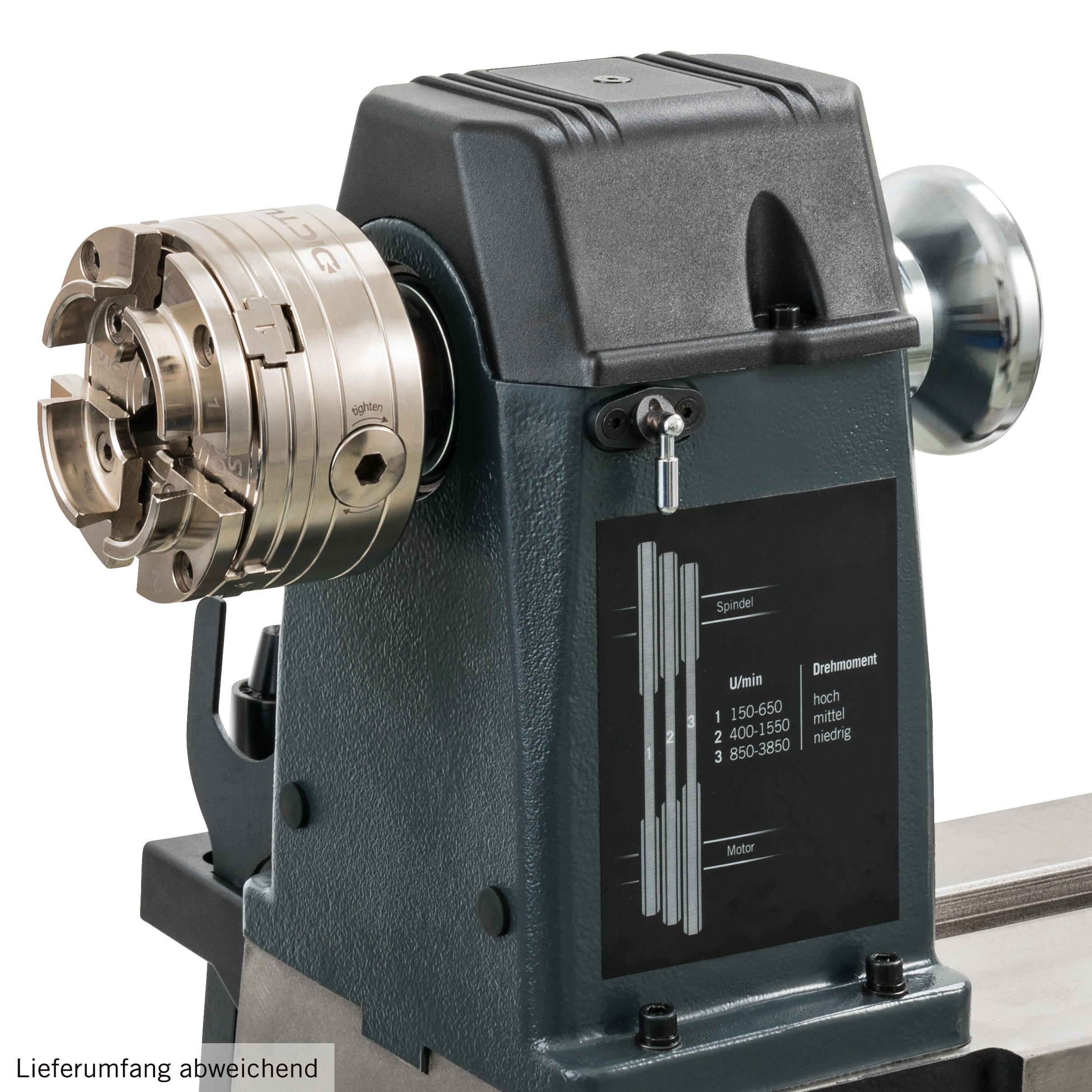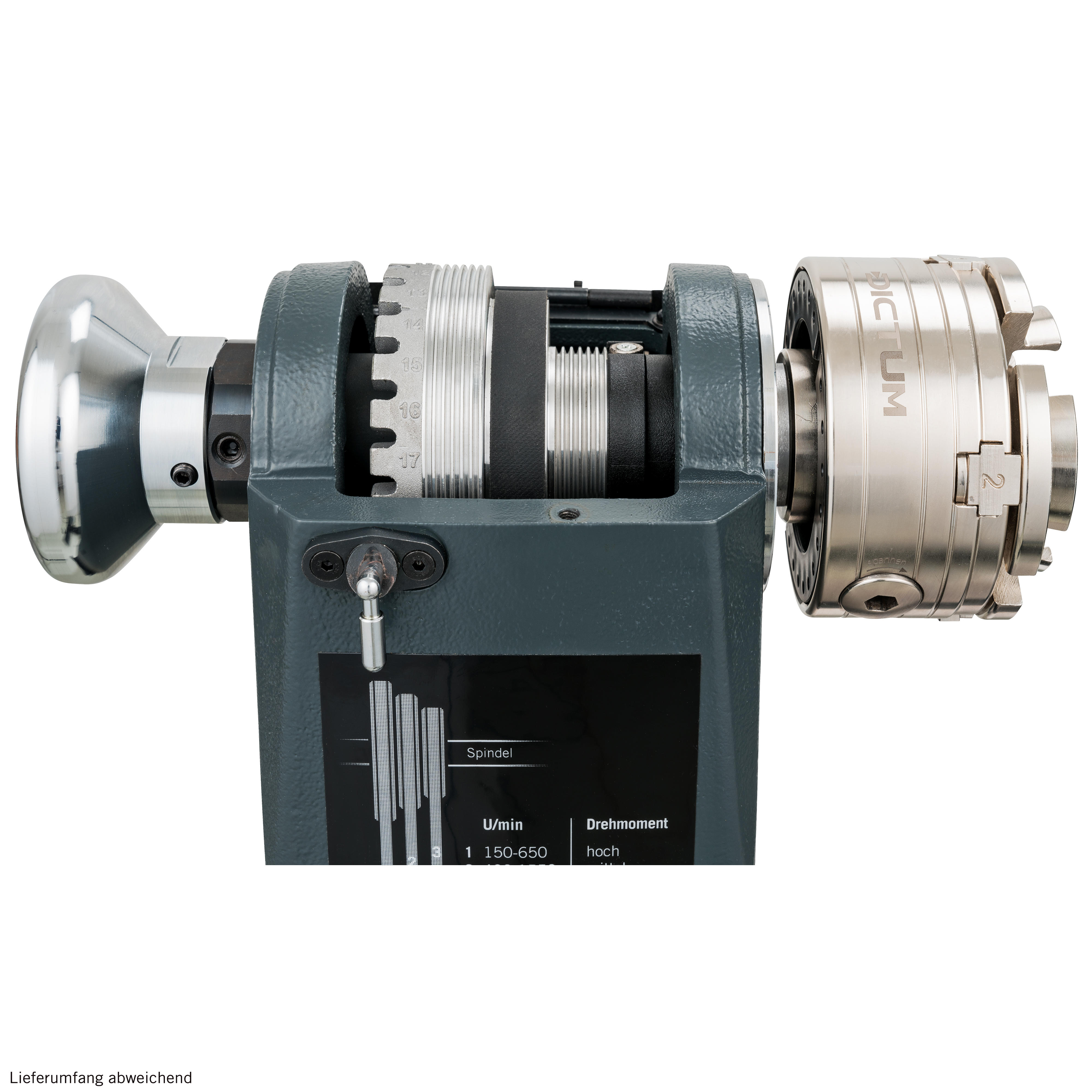 La broche est équipée d'un filetage M33 x 3,5 DIN 800 des deux côtés, pour le montage de mandrins, d’anneaux lapidaires etc. même sur le côté extérieur gauche de la poupée fixe. Il est ainsi possible d'usiner des pièces d'un diamètre jusqu'à 460 mm, par exemple des assiettes ou des saladiers.