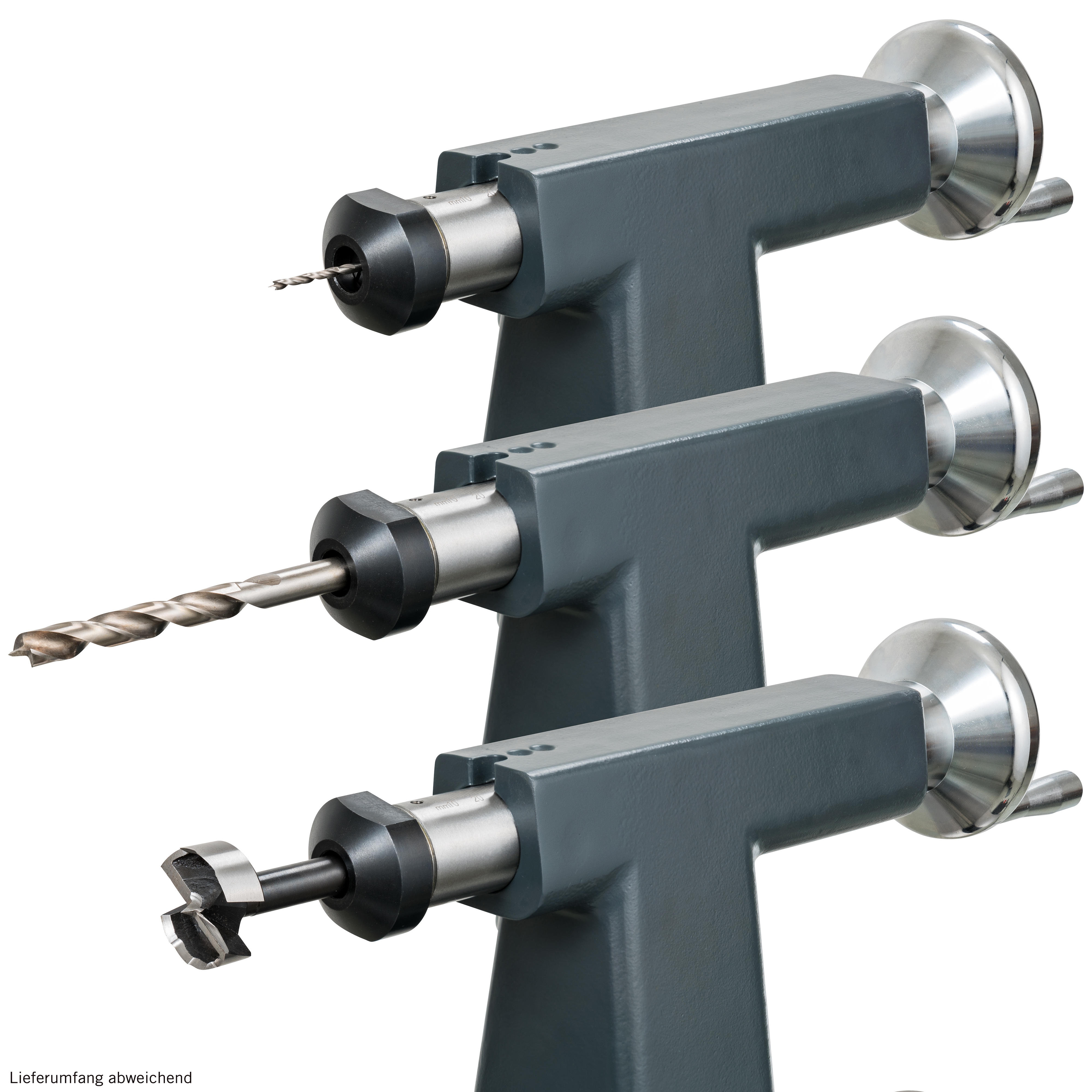 Le point fort : la contre-poupée avec une course de fourreau de 100 mm et une échelle graduée est équipée d'un filetage et d'un écrou pour le serrage des outils de perçage à l'aide de pinces de serrage direct MK2. Cela évite de réduire inutilement la distance de l’entrepointe et permet de ne pas avoir recours à des mandrins de perçage coûteux. En option, on peut monter sur la poupée mobile un gabarit de profondeur (N° 707789) doté d’une échelle graduée et d’un blocage de la profondeur.