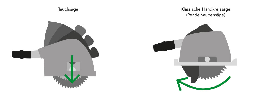 Sur une scie circulaire portative, en revanche, la profondeur de coupe est réglée de manière fixe et la lame de scie (y compris la partie de celle-ci qui s'engage dans la pièce à usiner) est recouverte d'un capot de protection pivotant monté sur ressort. D'où le terme de scie à capot oscillant. Lorsque l'on commence à couper sur le bord de la pièce, le capot de protection s'incline vers l'arrière. À la fin de la coupe, le capot pendulaire revient vers l'avant et recouvre la lame de scie circulaire. Les coupes en plongée ne sont pas possibles avec une scie circulaire portative.