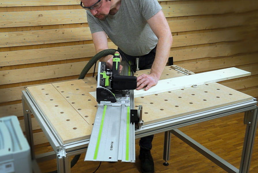 Une scie plongeante, associée à un rail de guidage parfaitement adapté, permet une précision extrême et un travail au millimètre près. Il est ainsi possible de réaliser des découpes dont le résultat est comparable à celui d'une scie à format professionnelle. Si, par exemple, le rail de guidage est équipé d'un pare-éclats, celui-ci empêche l'effilochage du bord de la scie. Le pare-éclats sur le rail de guidage est une lèvre en caoutchouc. Celle-ci appuie directement à gauche de l'arête de sciage sur la pièce à usiner et empêche ainsi l'effilochage ou l'arrachement. Sans cette lèvre, la lame de scie pousserait les fibres de bois vers le haut lors du mouvement ascendant.