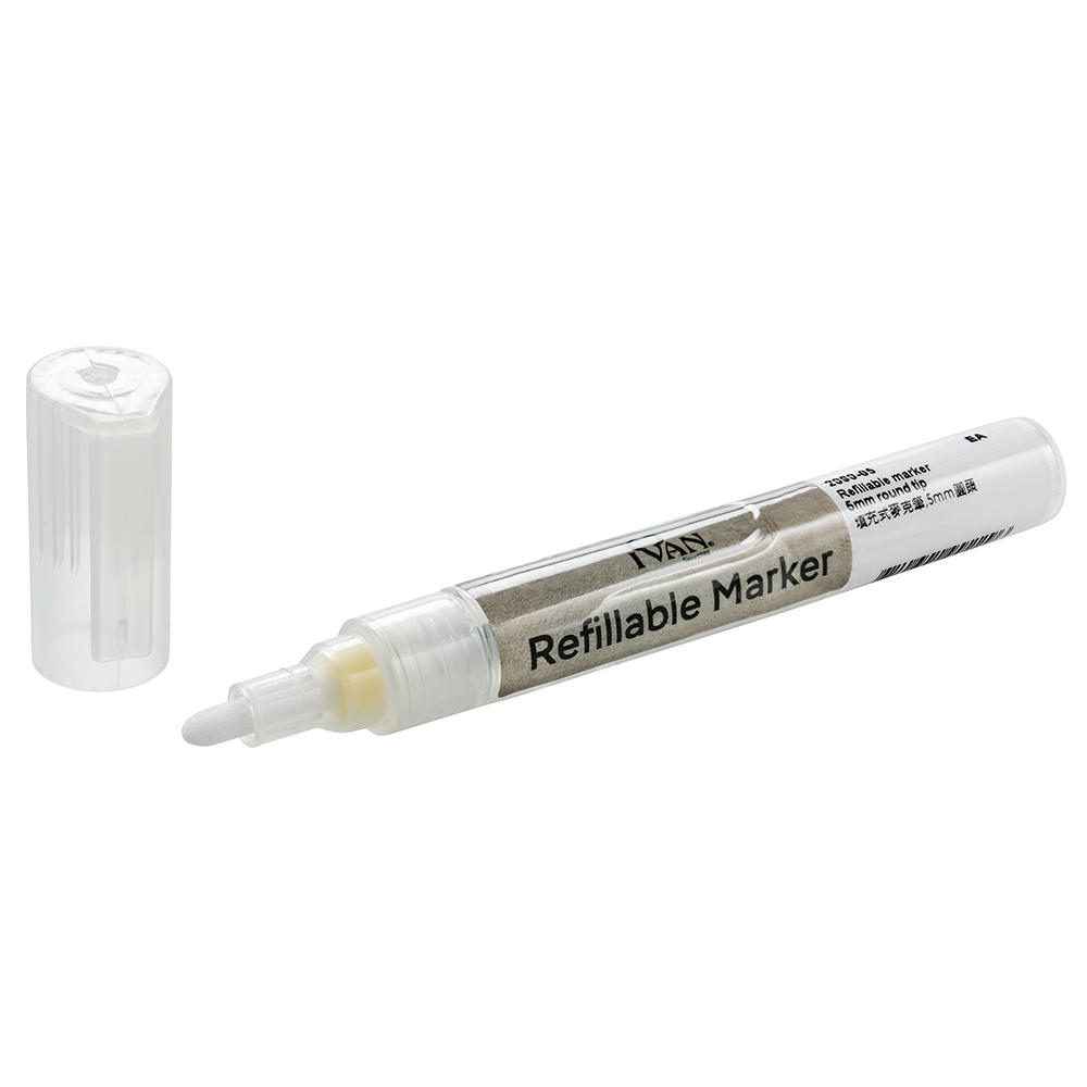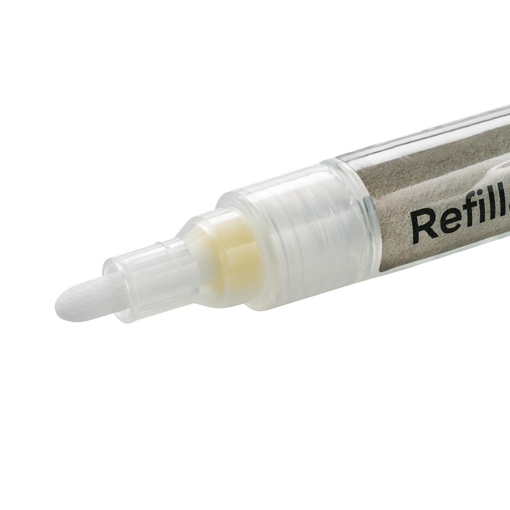 Le remplissage est très simple. Dévisser la tête, retirer la valve, verser la peinture et, après avoir tout refermé, les boules de mélange à l'intérieur veillent à ce que le liquide soit bien mélangé. Appuyer doucement sur la pointe pour libérer la couleur avec précision.
