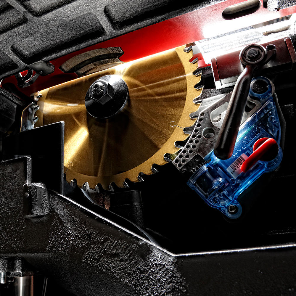La structure solide du cadre de forme tubulaire, une table de machine en aluminium revêtu par poudre et un moteur universel de 1800 watts garantissent une une coupe efficace et précise dans le temps. Une rainure en T de 3/8" x 3/4" à gauche et une à droite de la lame de scie offrent de multiples possibilités d'utilisation de la butée angulaire et des accessoires.