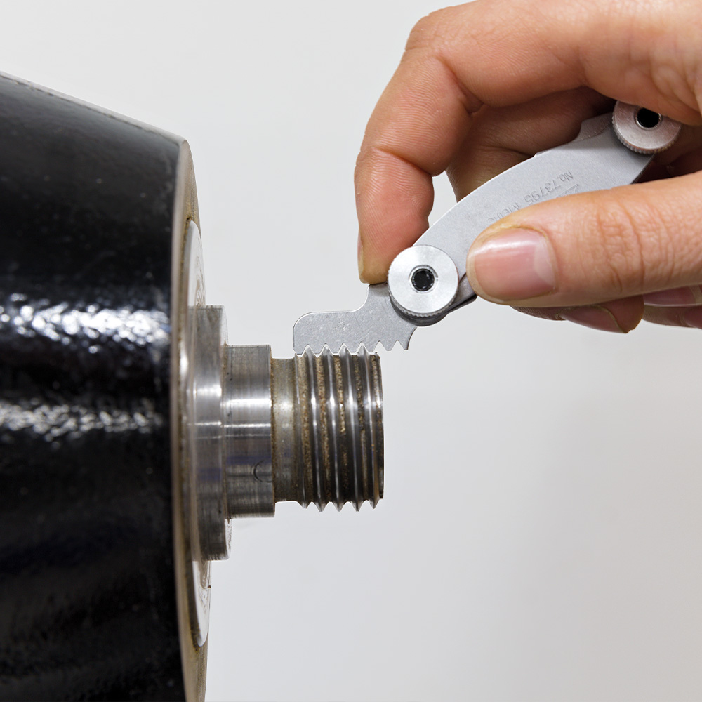 Pour le filetage métrique, il s'agit de la distance entre les pointes de filetage. Pour le filetage en pouces, il s'agit du nombre de pointes de filetage (également appelées vitesses) par pouce, c'est-à-dire par 25,4 mm. C'est ce que l'on appelle tpi (Threads Per Inch). Le pas de vis peut être relevé à l'aide d'un pied à coulisse, mais il est plus facile et plus sûr d'utiliser un calibre de filetage, surtout pour les petits pas de vis.
