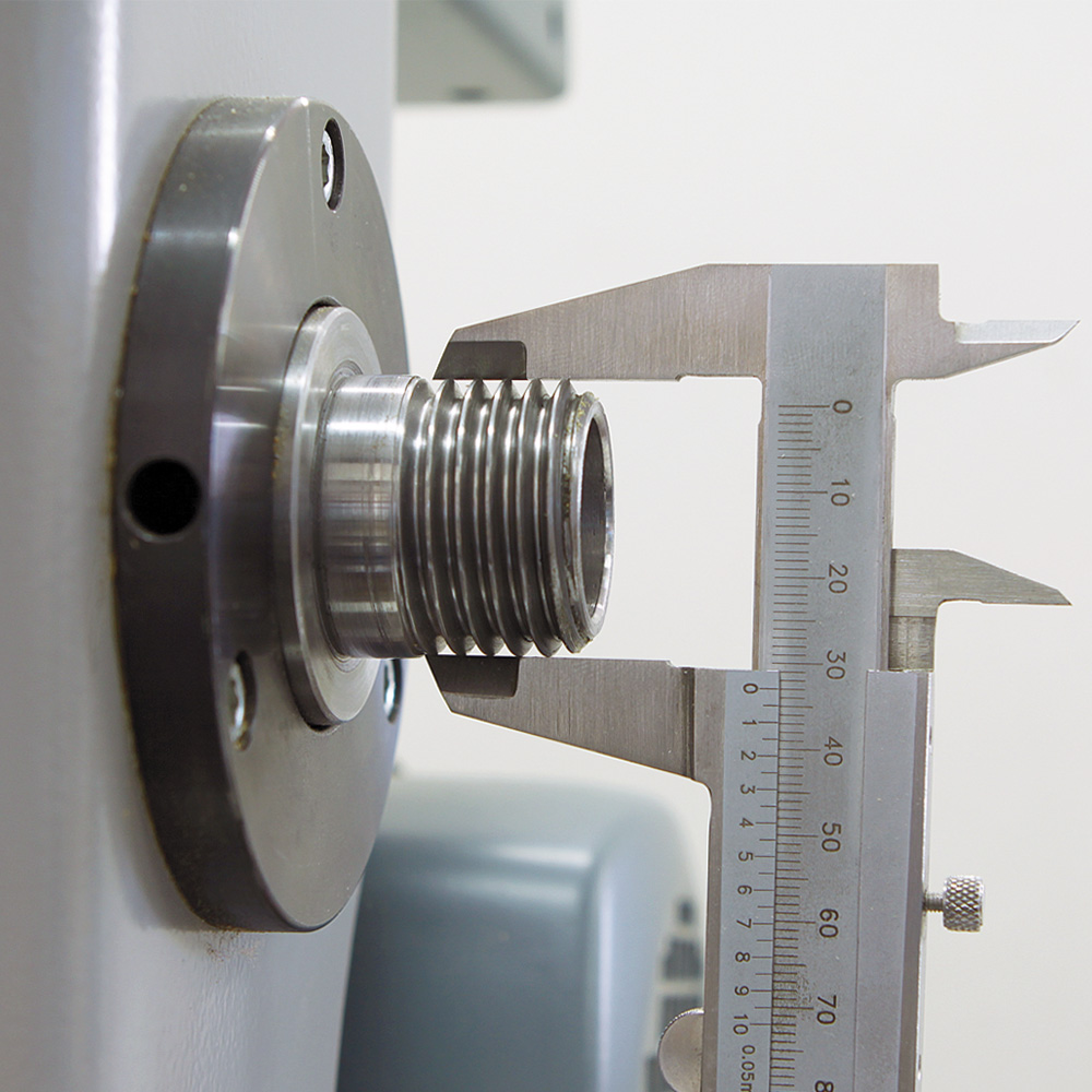 Le type de filetage courant des nouveaux tours à bois des fabricants européens est un filetage M33 DIN 800. Chez les fabricants américains, le filetage le plus courant est de 1 pouce x 8 tpi. Malheureusement, vous ne pouvez pas toujours vous y fier, et les anciens tours présentent souvent d'autres types de filets sur la broche principale. Pour pouvoir choisir les accessoires appropriés (par ex. Anneaux lapidaires, mandrins de tournage ou adaptateurs), il est indispensable de connaître la taille du filetage de la broche principale. La plupart du temps, le plus simple est de déterminer le type de filetage en consultant la plaque signalétique, le fabricant ou le mode d'emploi. Les indications sur le Type et l'année de construction du tour à bois sont très utiles à cet égard. Il est également possible de visser un filetage intérieur (par exemple d'un mandrin à 4 mors) sur la broche principale. Si le type de filetage du mandrin est connu et qu'il s'adapte à la broche, le type de filetage de la broche est identifié.