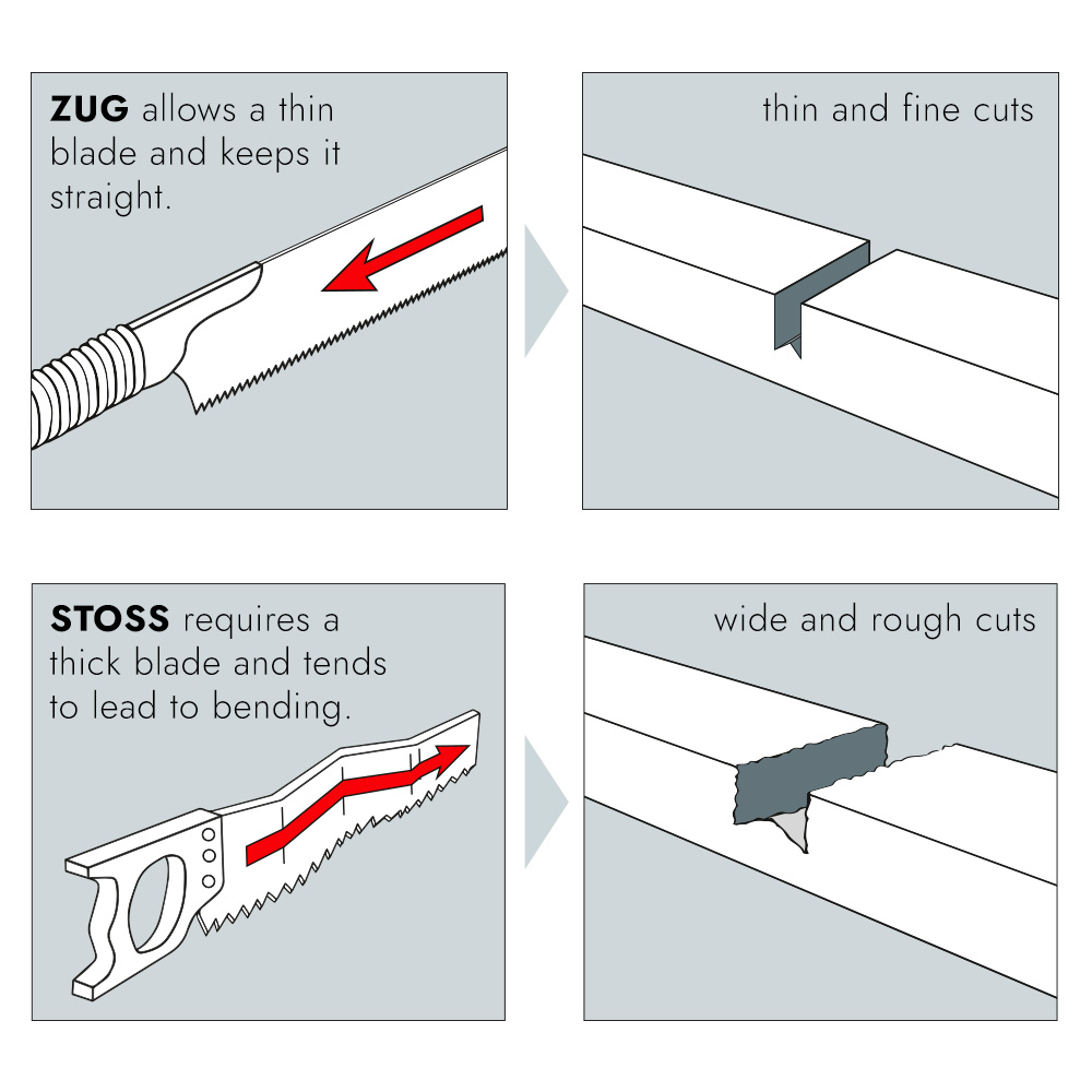 Les scies conventionnelles coupent en poussant, ce qui nécessite des lames relativement épaisses pour garantir une stabilité suffisante. Les scies japonaises, quant à elles, coupent en tirant. Les lames peuvent donc être beaucoup plus fines, car elles ne sont soumises qu’à une traction et ne risquent pas de se déformer. Les traits de scie sont ainsi plus fins et l'effort de coupe est nettement réduit.