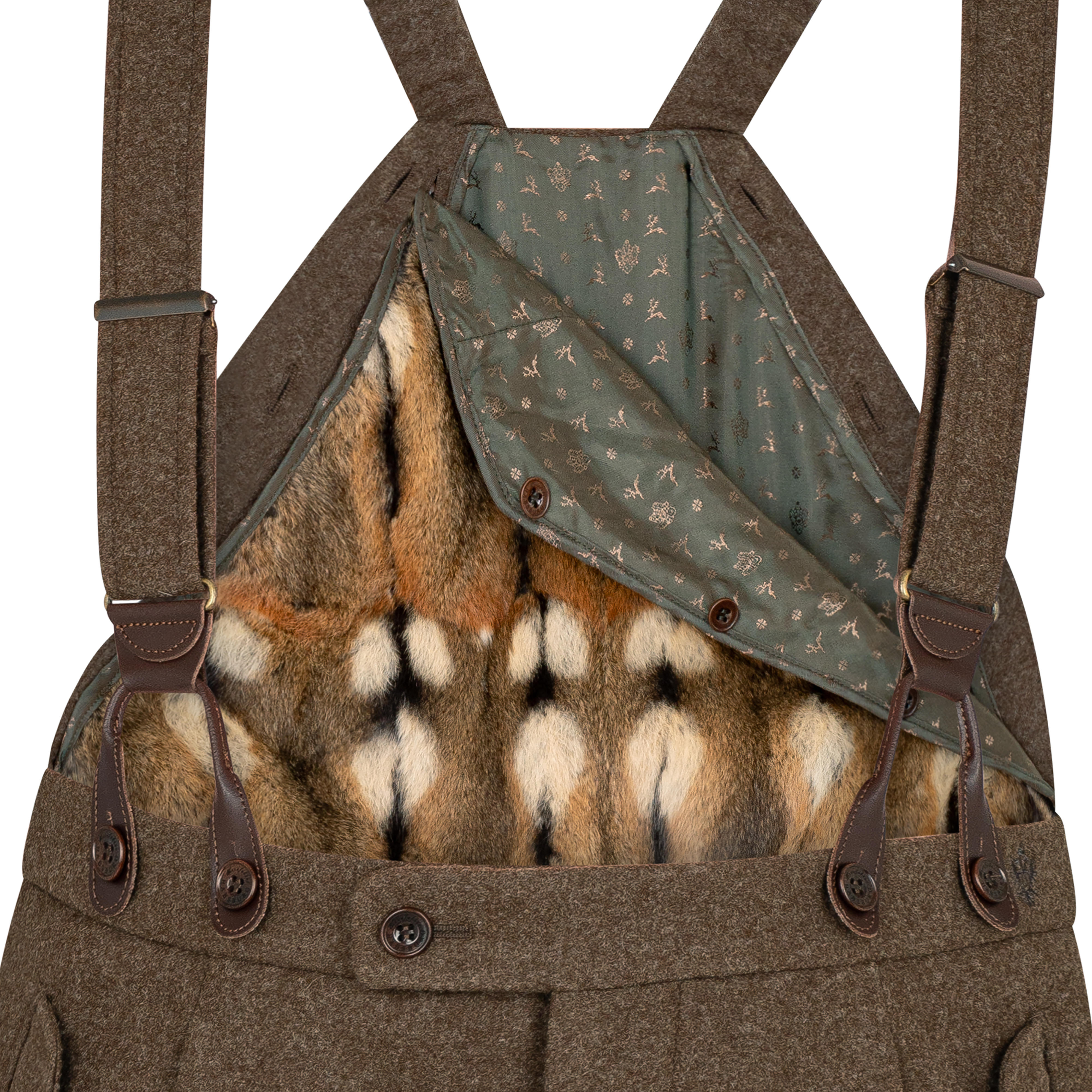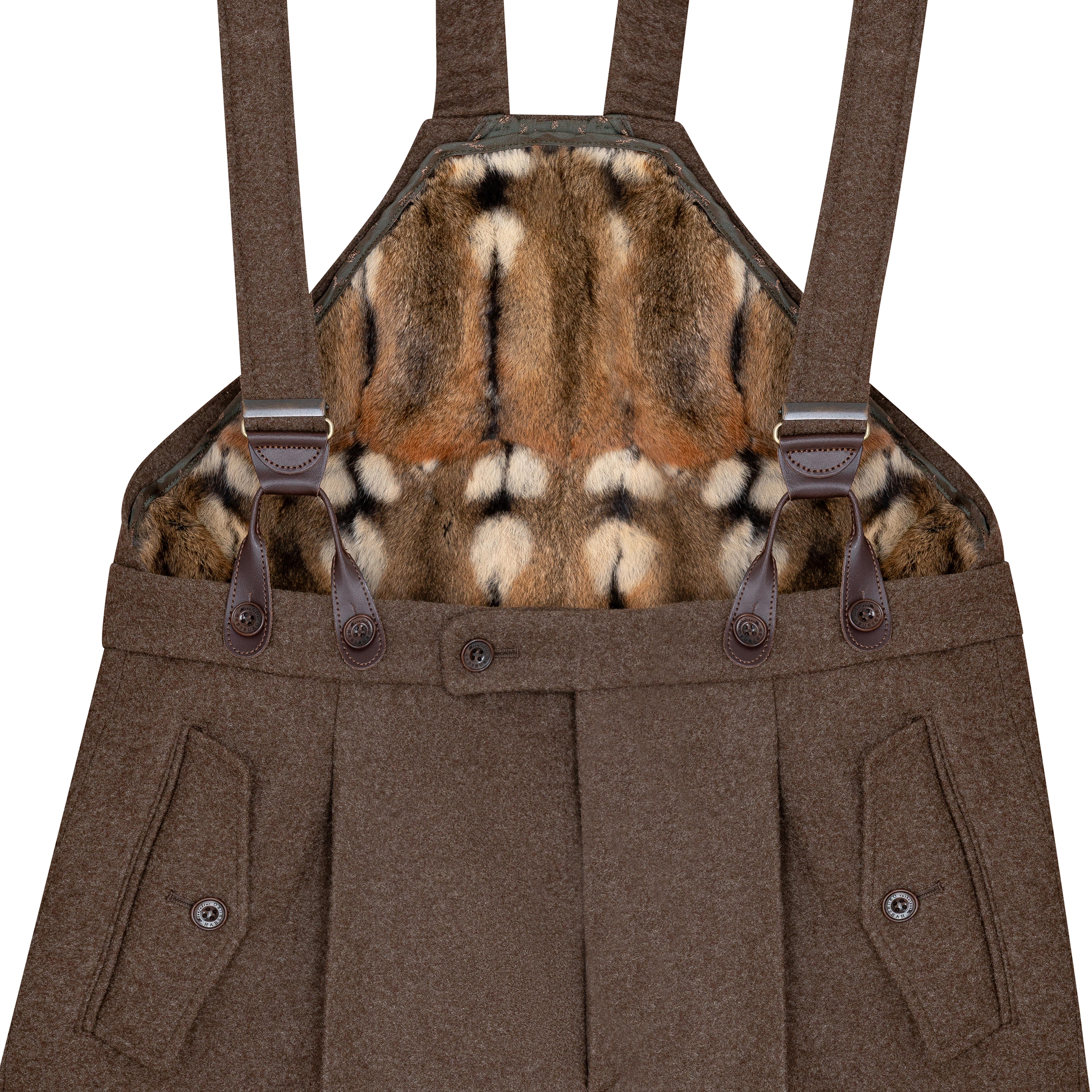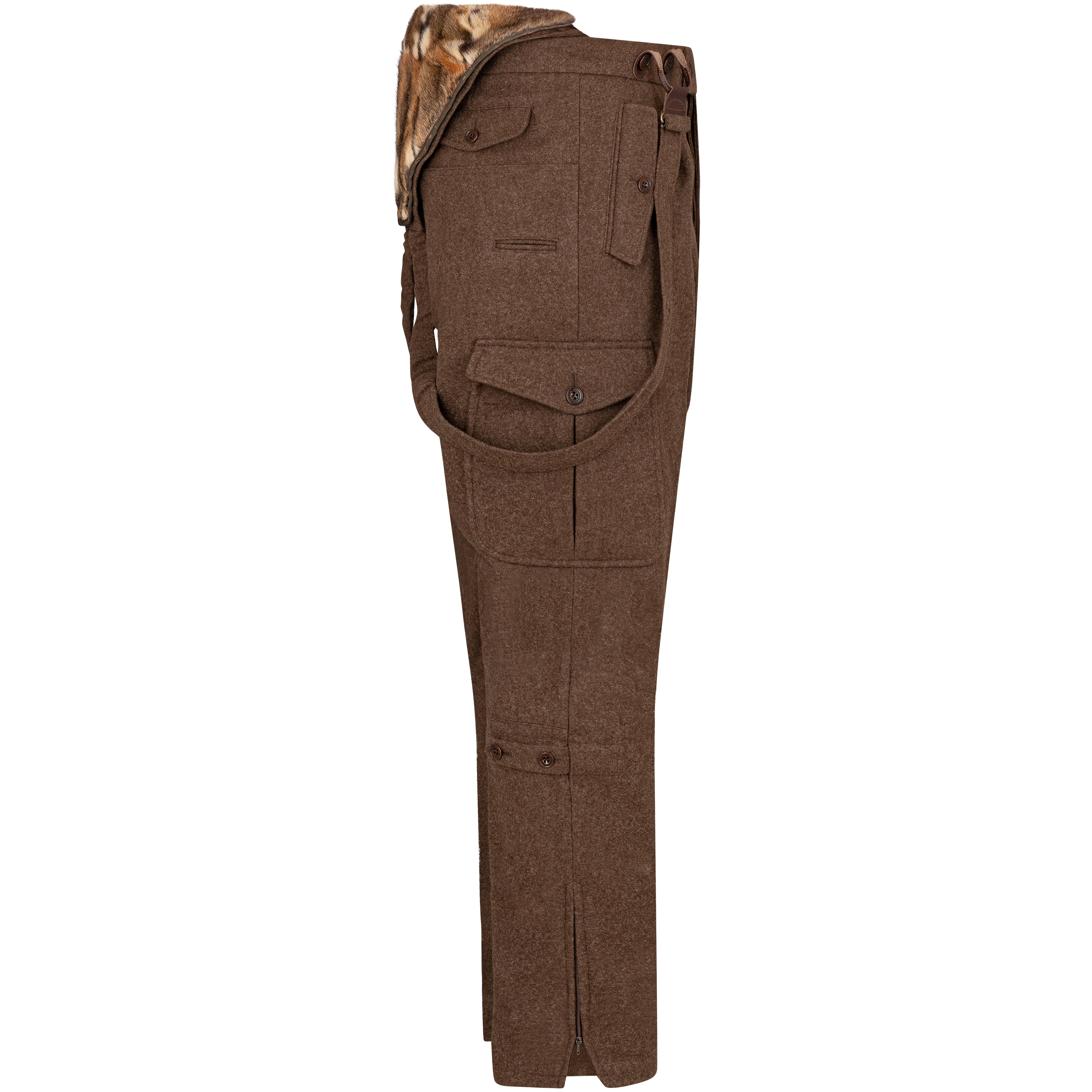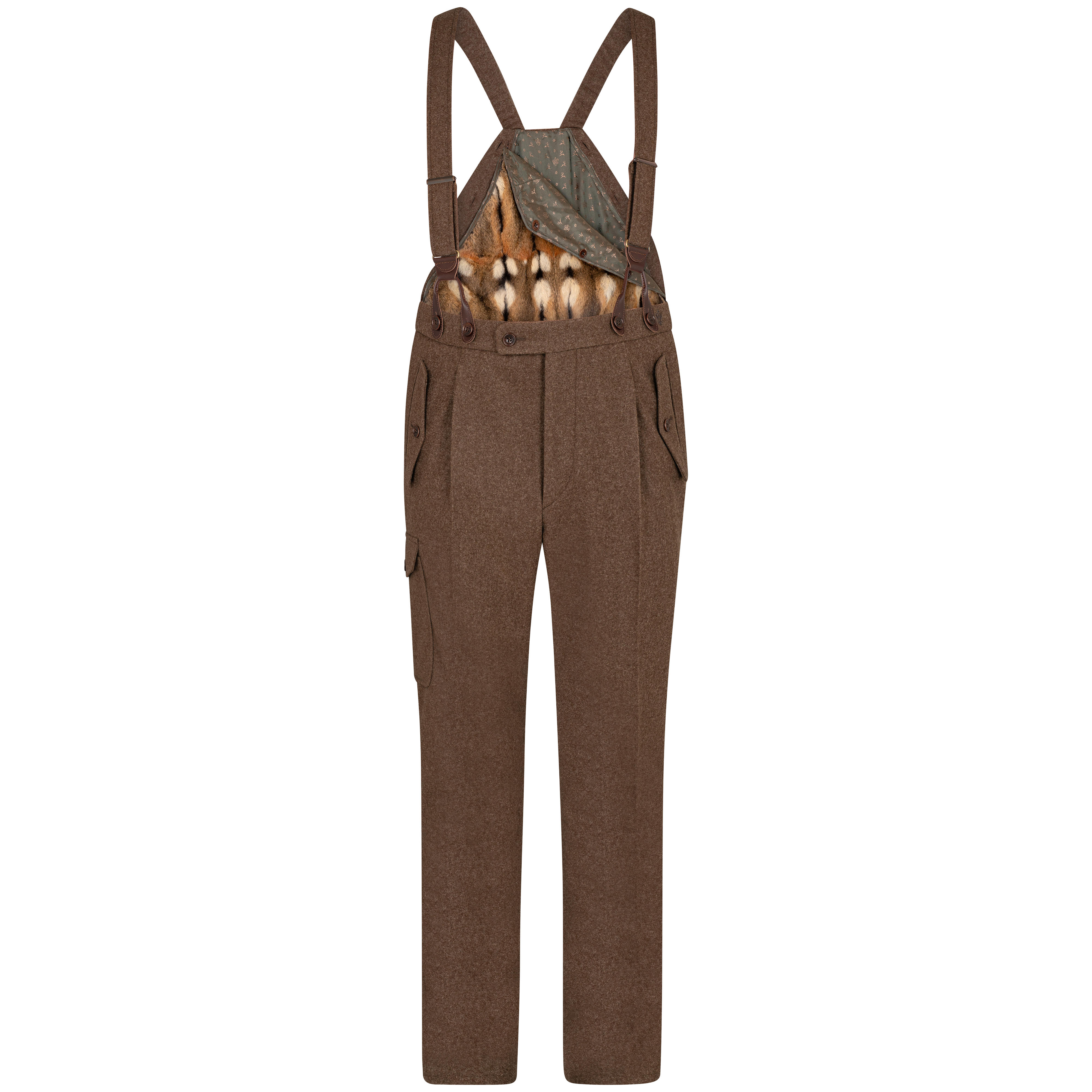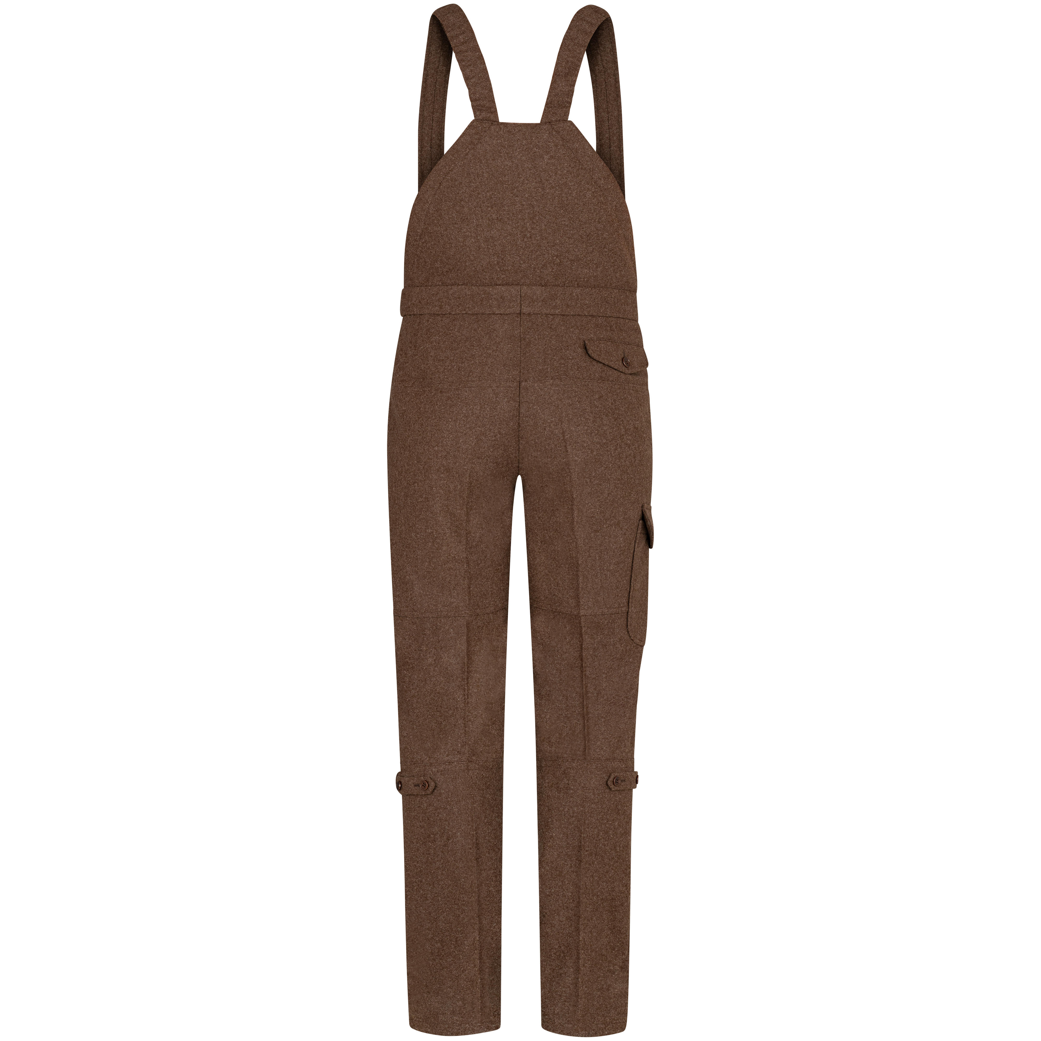 Les bretelles sont fixées à l'avant par des boucles en cuir réglables et leur longueur peut être adaptée. Deux poches diagonales à rabat avec boutons en corozo sur le devant, deux autres poches à rabat fermables au dos, ainsi qu'une poche plaquée spacieuses sur la jambe droite du pantalon est assez grande pour ranger les outils les plus importants. La poche à couteau sur la jambe droite du pantalon complète parfaitement ce pantalon fonctionnel.