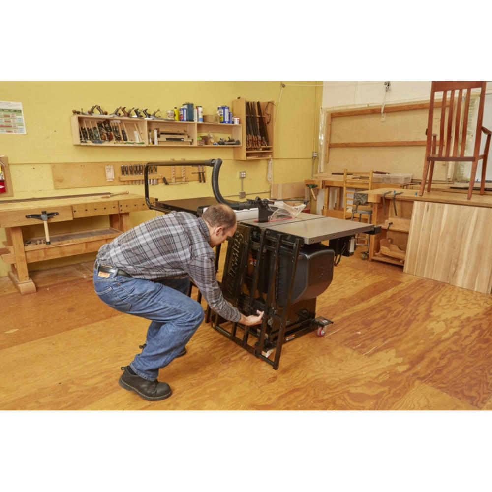 Réduisez l'espace nécessaire dans votre atelier en repliant rapidement la rallonge de table et en la rangeant à l'arrière de la machine pour gagner de la place. Pour un gain de place encore plus important, nous vous recommandons de combiner cette table pliante avec la SawStop "Mobile Base" (n° 721769K).