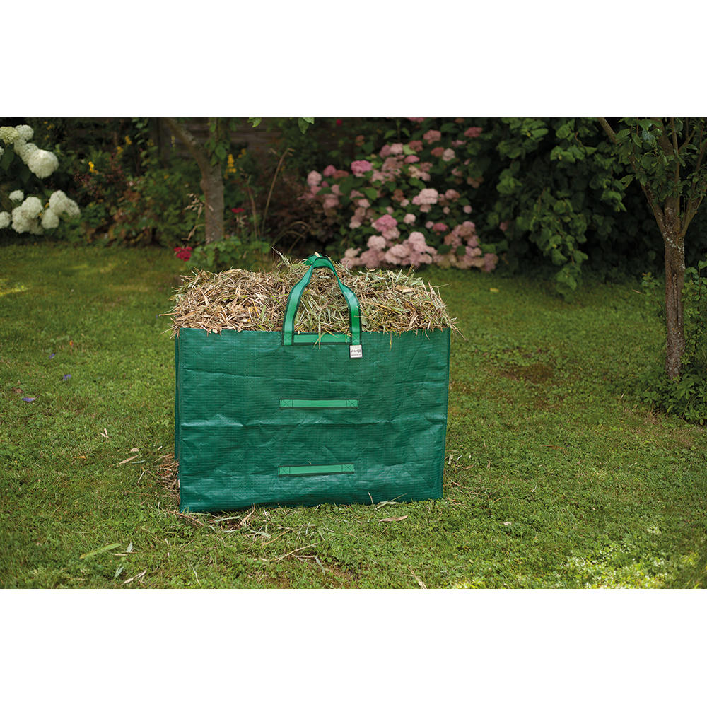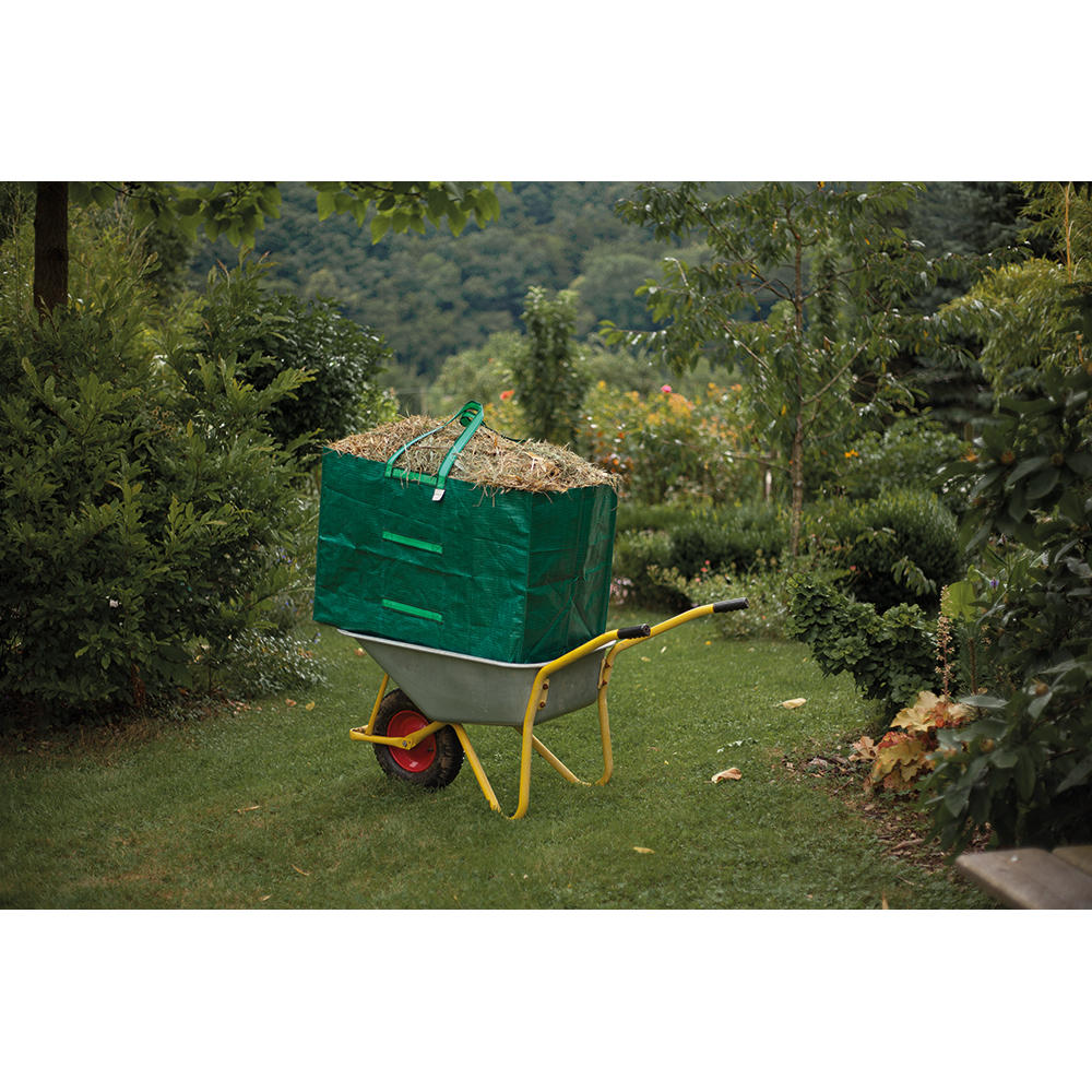 Sac à déchets de jardin grand, robuste et polyvalent! Placé sur la brouette, il en augmente la capacité et facilite ainsi le transport dans le jardin. Il reste propre dans le coffre de la voiture lorsque les déchets verts doivent être amenés au point de collecte. Grâce à sa forme rectangulaire, la plupart des voitures peuvent même recevoir deux sacs côte à côte. Pour un remplissage facile, le film en tissu solide tient debout tout seul et peut être replié pour gagner de la place une fois le travail terminé. 2 boucles de transport résistantes à la déchirure et 4 poignées robustes de différentes hauteurs facilitent le transport et le vidage de cet énorme sac à déchets de jardin.