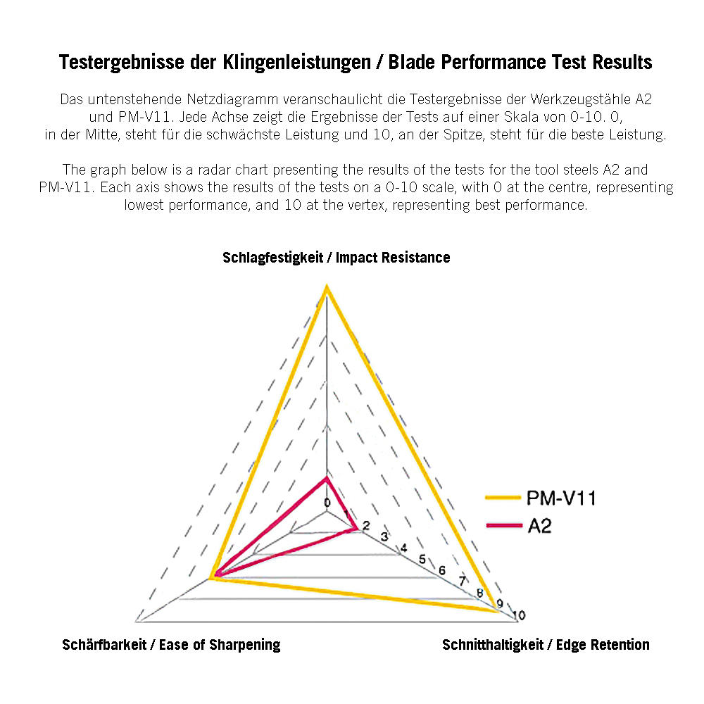 PM-V11-Stahl wird aus einer neuartigen, pulvermetallurgischen Stahllegierung hergestellt. Durch seine extrafeine und gleichmäßige Materialstruktur sowie der hohen Härte (HRC 61-63) erreicht dieser Stahl eine doppelt so hohe Standzeit im Vergleich zum A2-Stahl. PM-V11-Hobeleisen lassen sich rasiermesserscharf schleifen und sind extrem verschleißfest, selbst bei einem Fasenwinkel von unter 20°. Alle Eisen werden mit einer angeschliffenen 2°-Mikrofase geliefert. Schärfbar auf gängigen Wassersteinen.