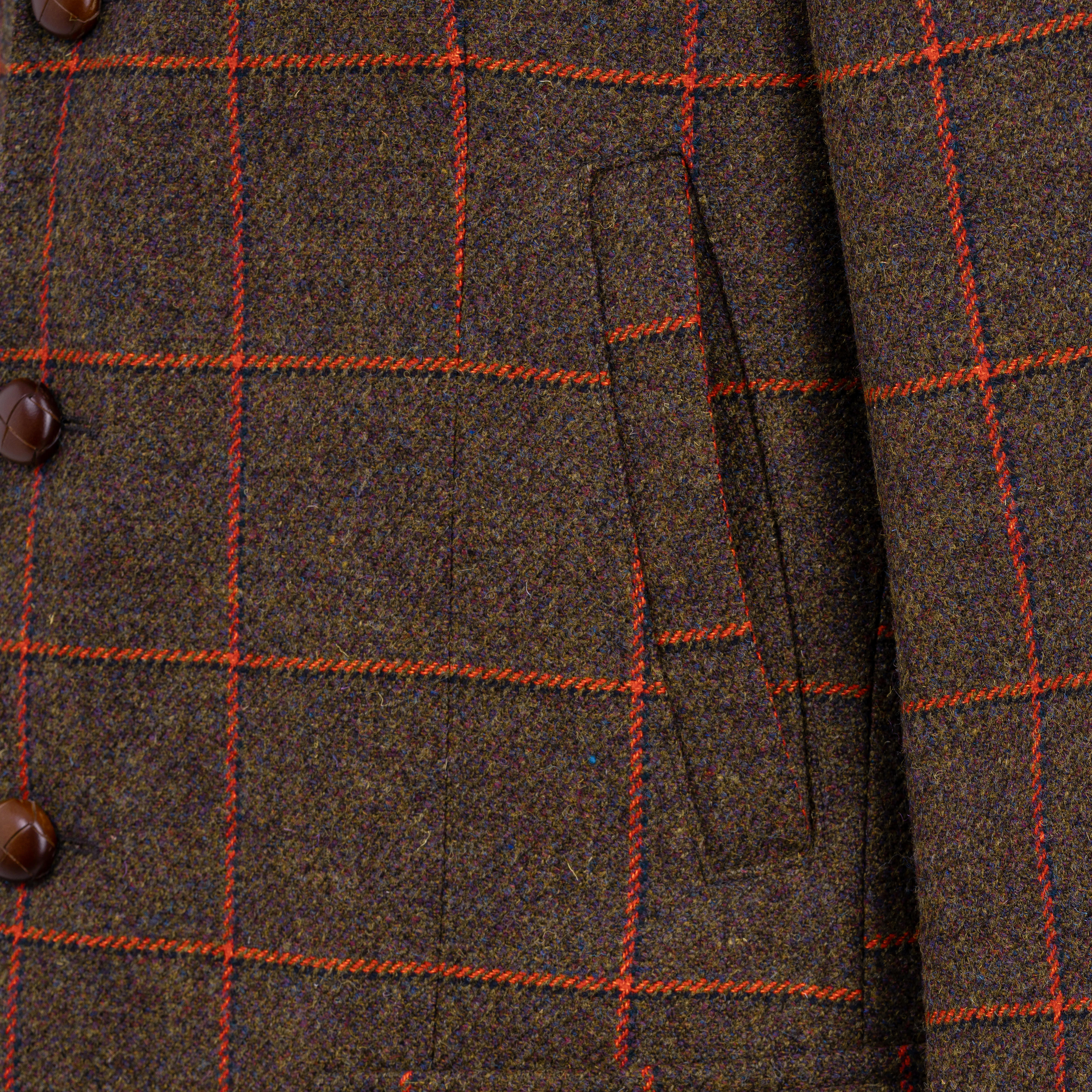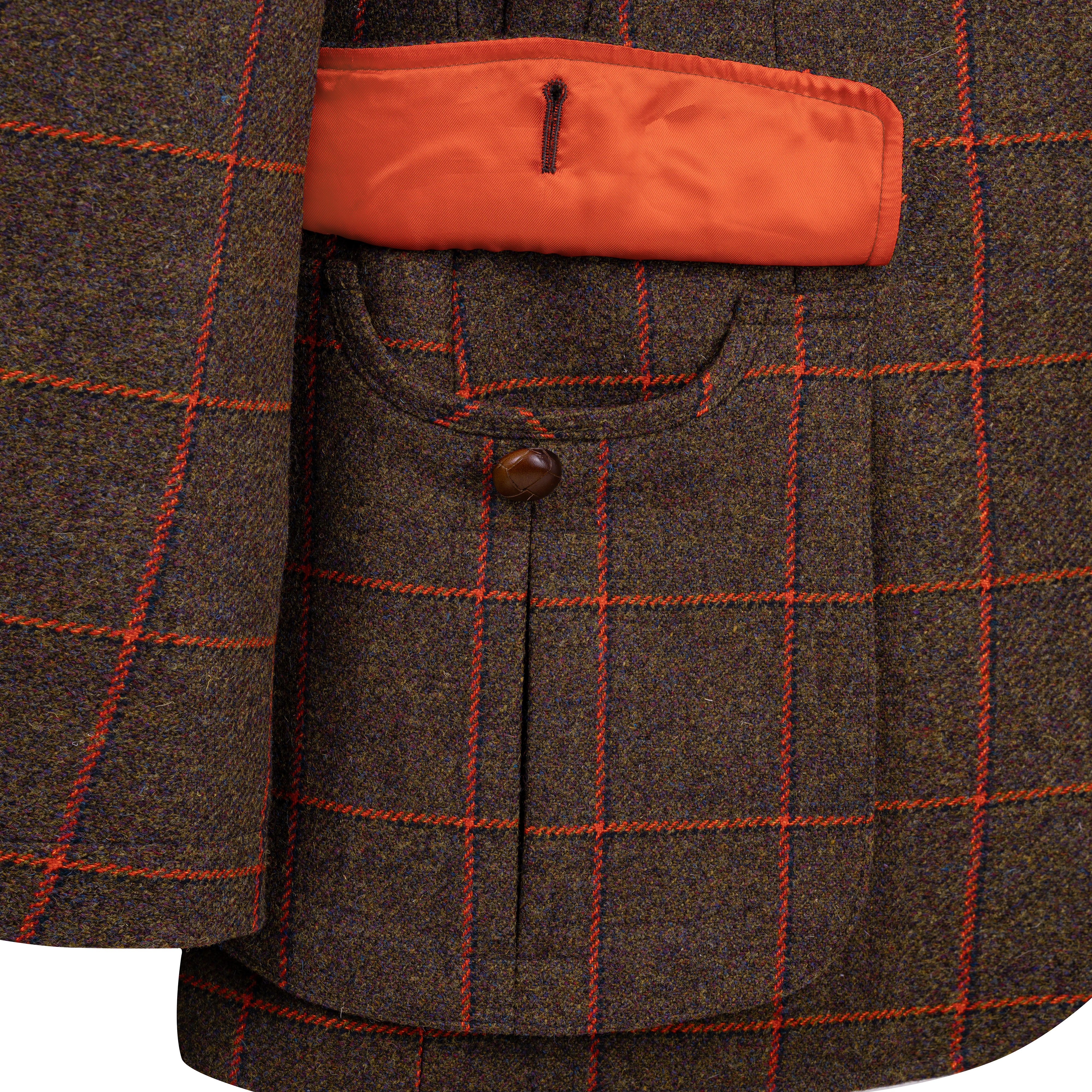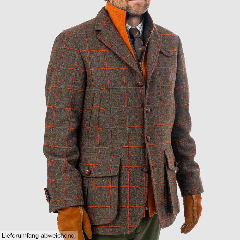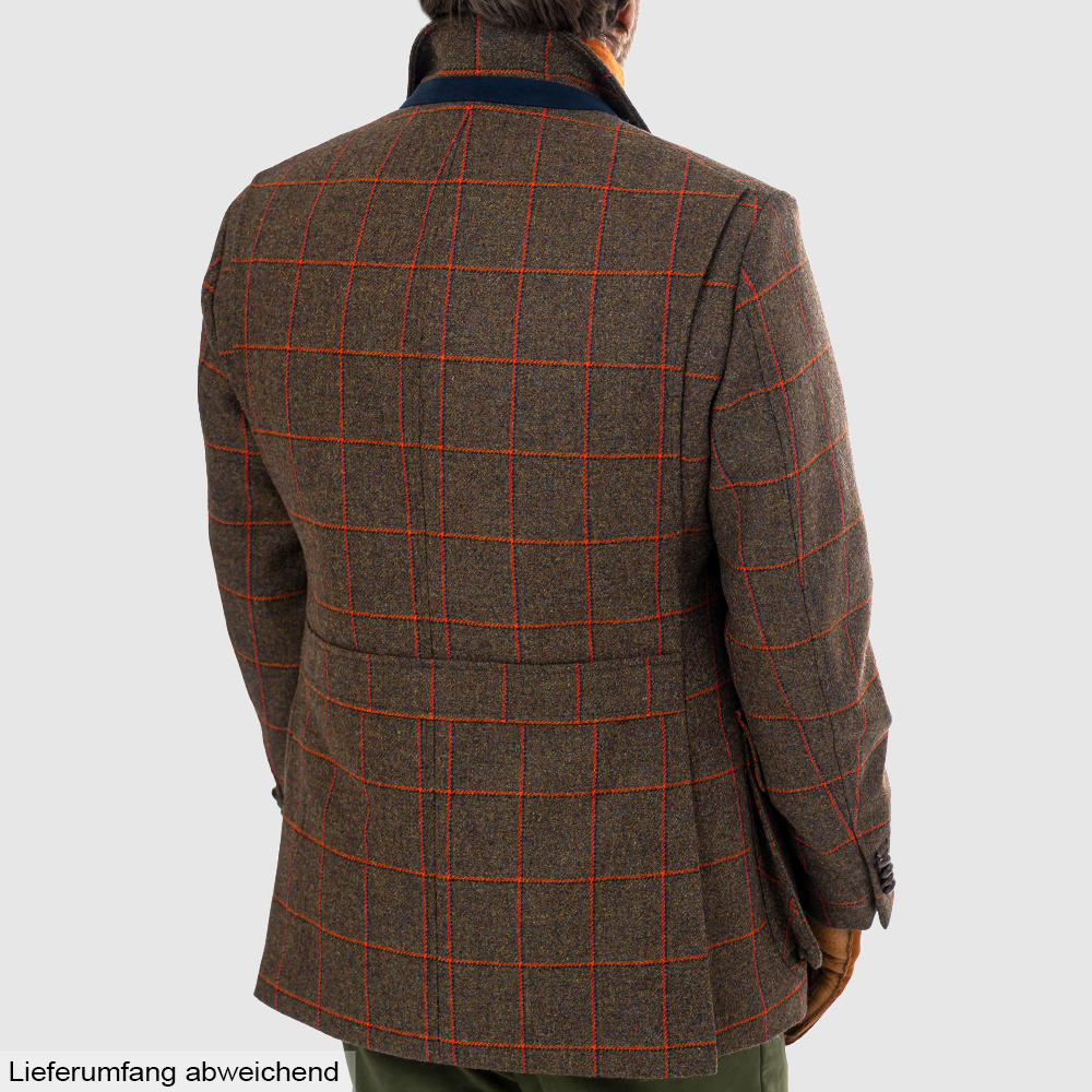 Le tweed robuste se distingue par sa tonalité vert olive profonde, accentué par des motifs carreaux coloris rouge rouille. Il est tissé dans le célèbre Lovat Mill, un atelier de tissage traditionnel situé à Hawick, en Écosse. Avec un poids de 640 g/ml (21 oz.), il fait partie des tweeds classiques de gamekeeper, tels qu'ils étaient portés autrefois par les gardes-chasse britanniques. Le revêtement en téflon confère à la veste une protection supplémentaire contre la pluie et les salissures, de sorte qu'elle reste efficace même dans des conditions défavorables.