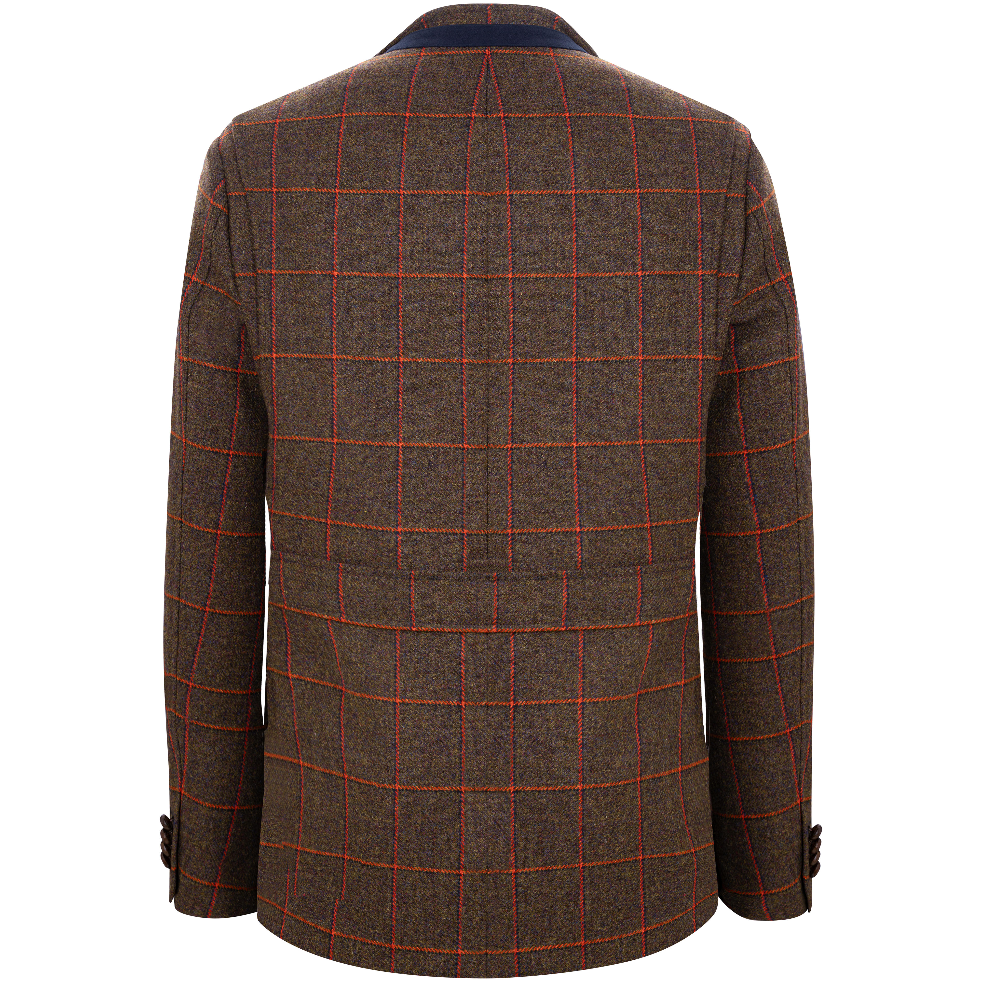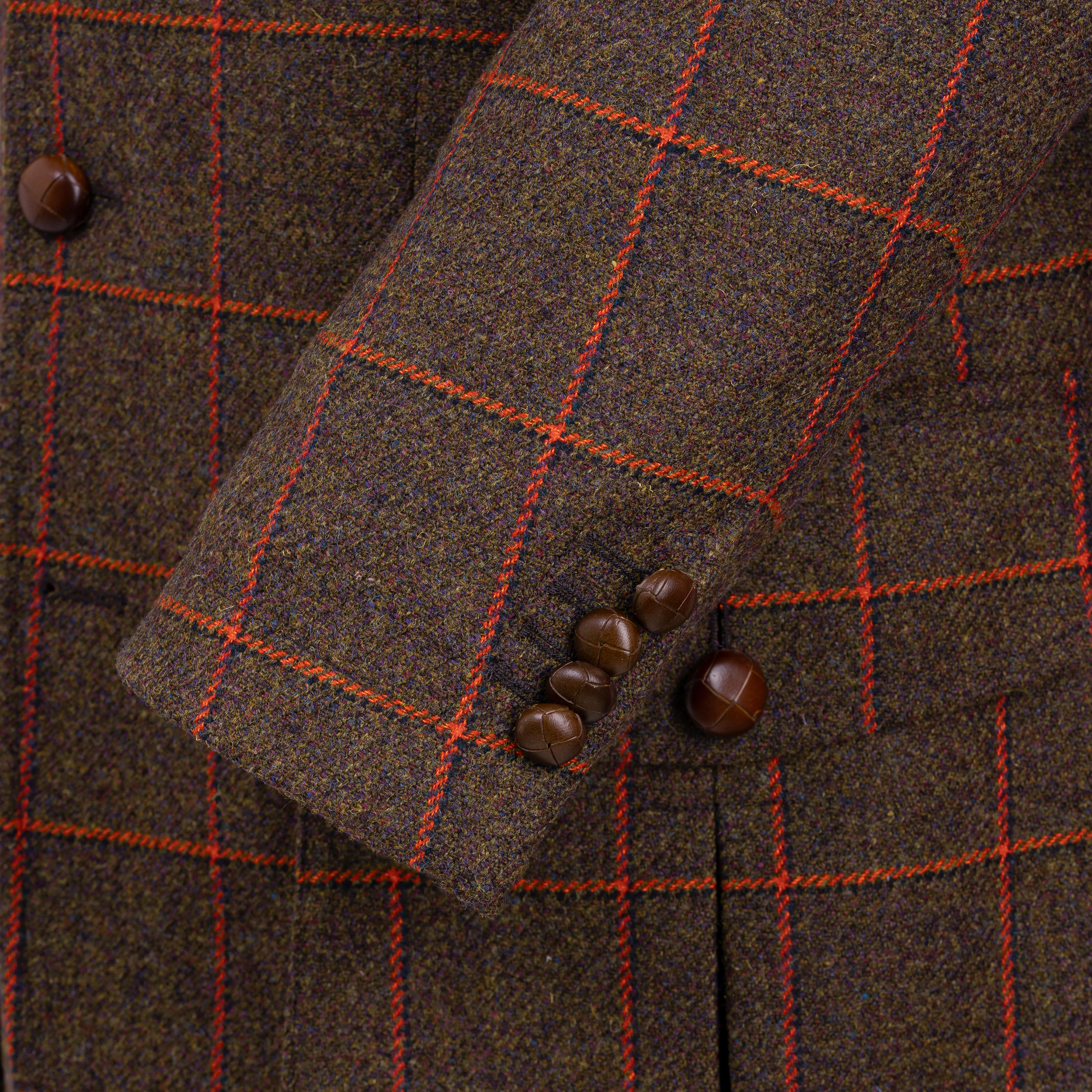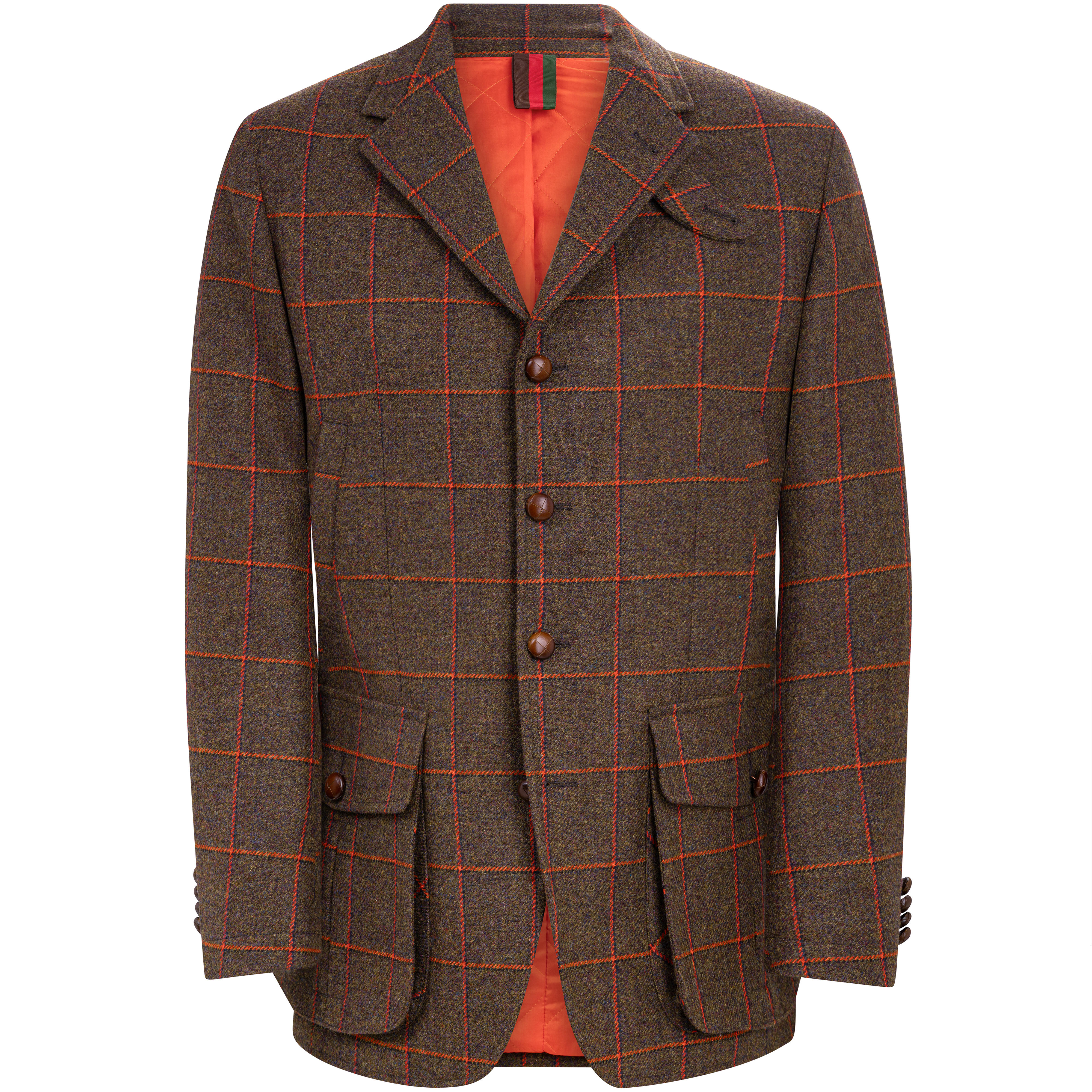 Le tweed robuste se distingue par sa tonalité vert olive profonde, accentué par des motifs carreaux coloris rouge rouille. Il est tissé dans le célèbre Lovat Mill, un atelier de tissage traditionnel situé à Hawick, en Écosse. Avec un poids de 640 g/ml (21 oz.), il fait partie des tweeds classiques de gamekeeper, tels qu'ils étaient portés autrefois par les gardes-chasse britanniques. Le revêtement en téflon confère à la veste une protection supplémentaire contre la pluie et les salissures, de sorte qu'elle reste efficace même dans des conditions défavorables.