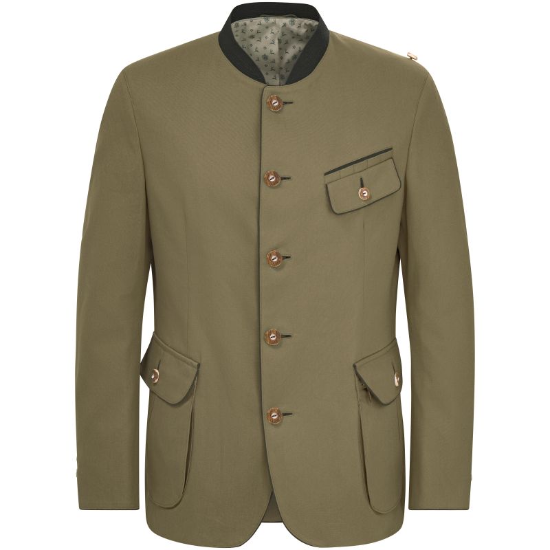 Eine leichte Schulterwattierung sorgt zusammen mit der Kellerfalte, die durch einen dekorativen Zierriegel betont wird, und dem Futter mit Habsburger Wappen und springendem Hirsch für perfekten Sitz und ergänzt das traditionelle Gesamtbild. Echte Hirschhornknöpfe und Kontraste aus feinem grünem Tuchloden runden das Erscheinungsbild harmonisch ab.