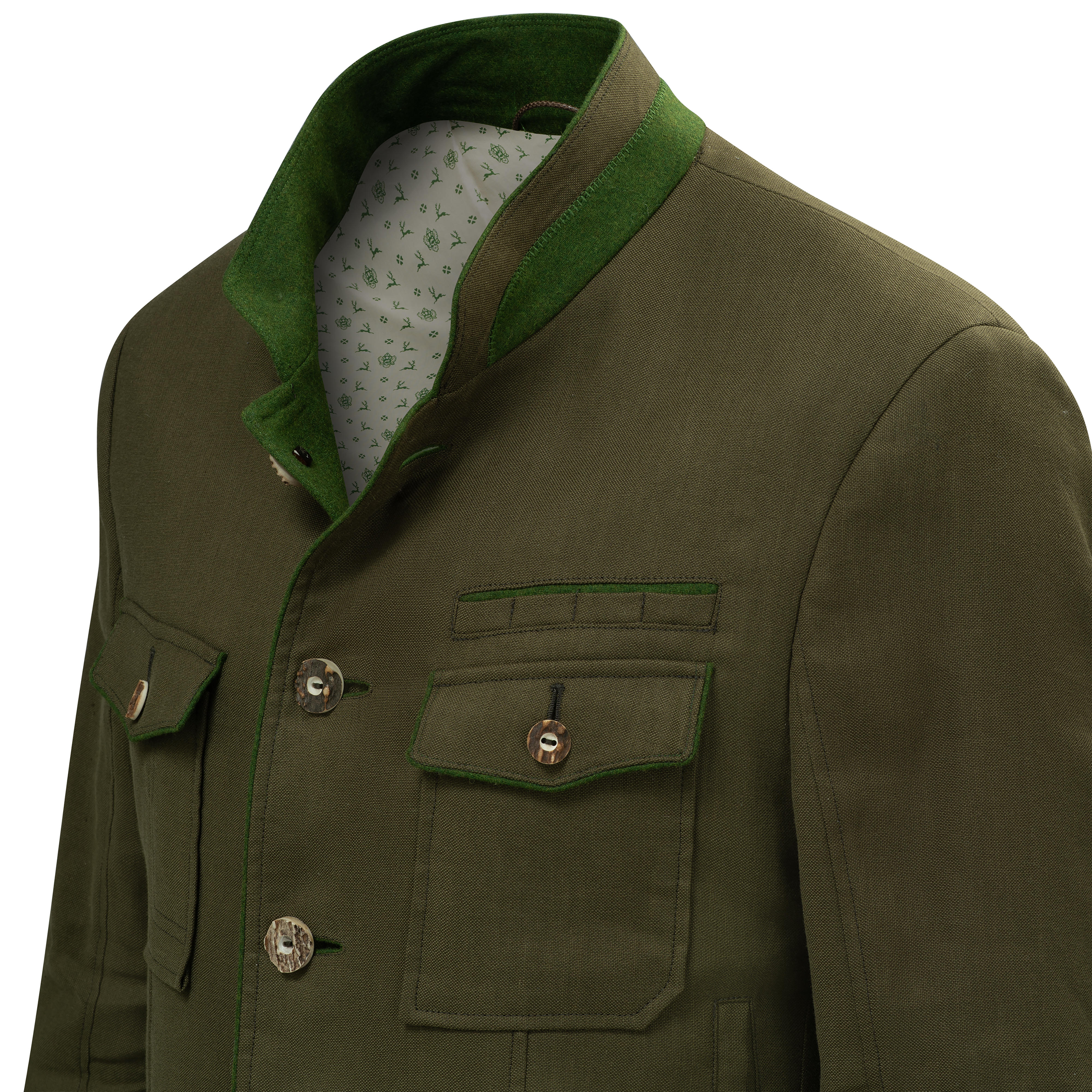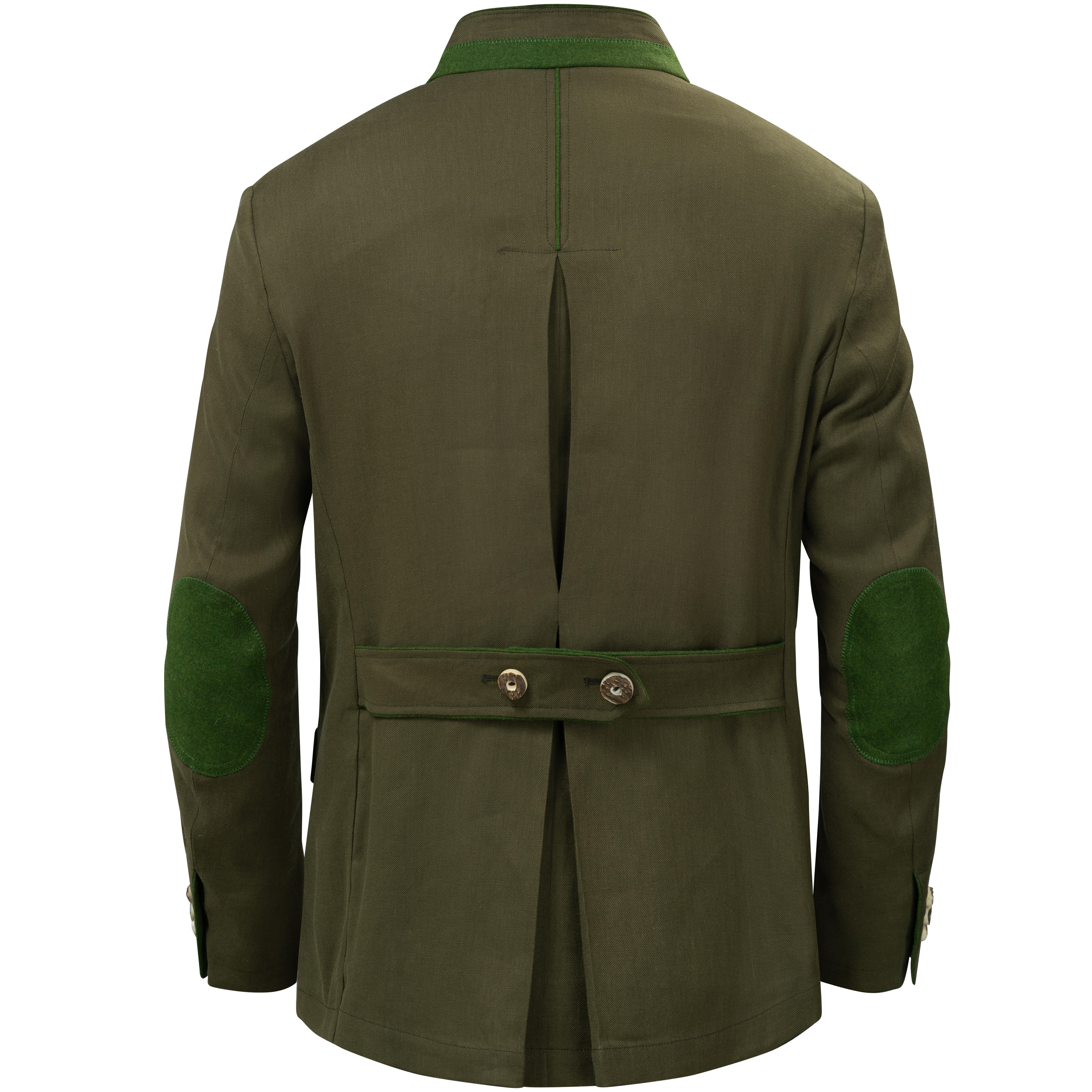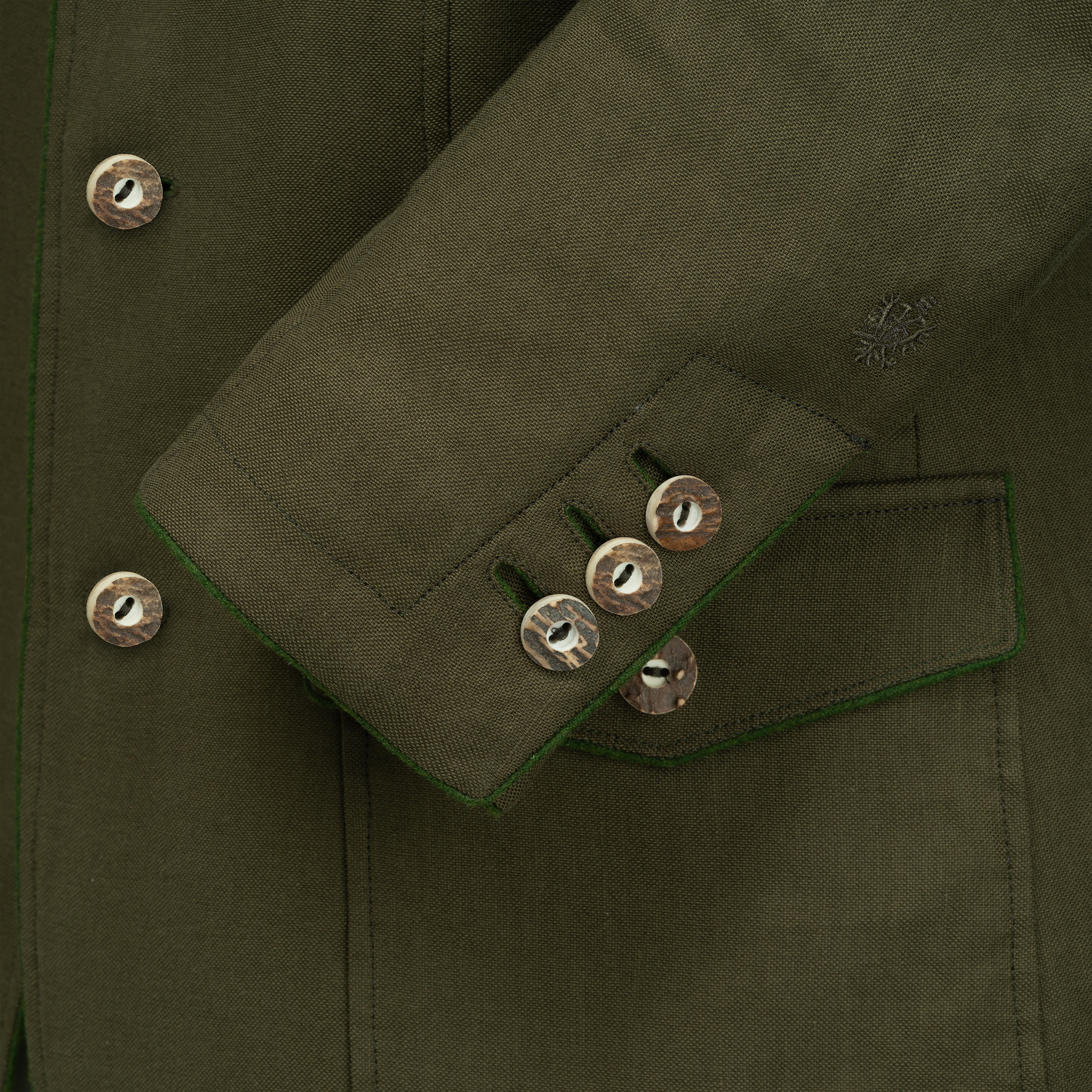 Die Jagdjacke »Adrian« ist aus angenehm leichtem Baumwoll-Leinen-Viskose Qualität gefertigt. Ein zusätzlicher Elasthan Anteil und der bequeme Schnitt mit Mittelschlitz und Quetschfalte im Rückenteil sorgen für einen komfortablen Sitz bei jeder Gelegenheit. Die Jacke verfügt über vier aufgesetzte Pattentaschen, zwei seitliche Eingriffstaschen, eine zusätzliche Patronentasche und zwei verschließbare Innentaschen, die ausreichend Platz für die wichtigsten Utensilien bieten. Hochwertige Details wie verstürzte Knopflöcher, echte Hirschhornknöpfe, Kontraste aus feinem grünem Tuchloden sowie die doppelte Nahtverarbeitung an den Ärmelpatches unterstreichen die jagdliche Authentizität der Jacke.