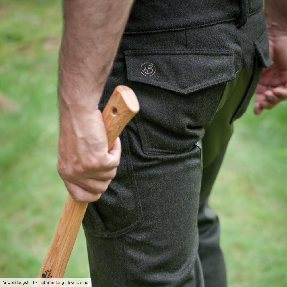 - Die Beinweite ist so angelegt, dass die Hose auch über dem Stiefel tragbar ist. Die Stoßkante ist mit Leder paspeliert.