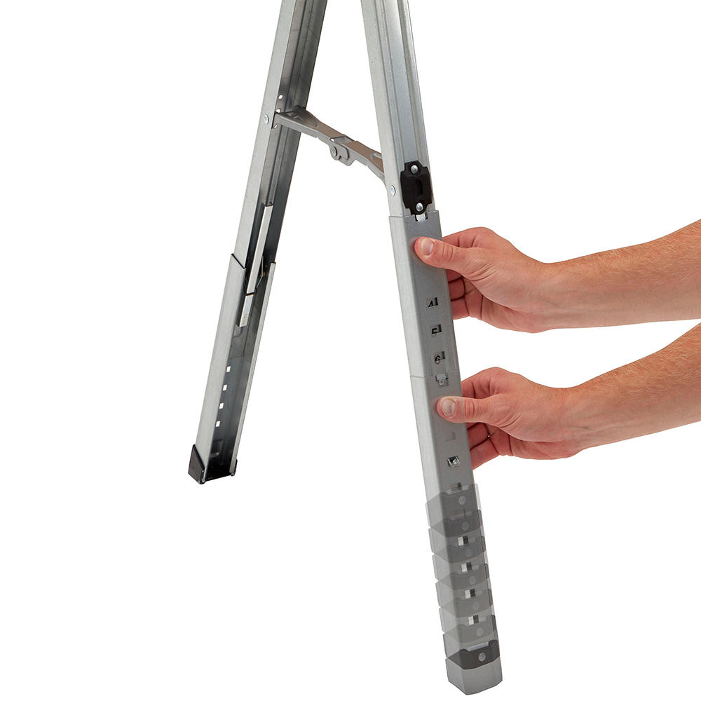 - Le leve alle estremità consentono di ripiegare le gambe in modo semplice e rapido, consentendo di trasportare e riporre i cavalletti in modo semplice