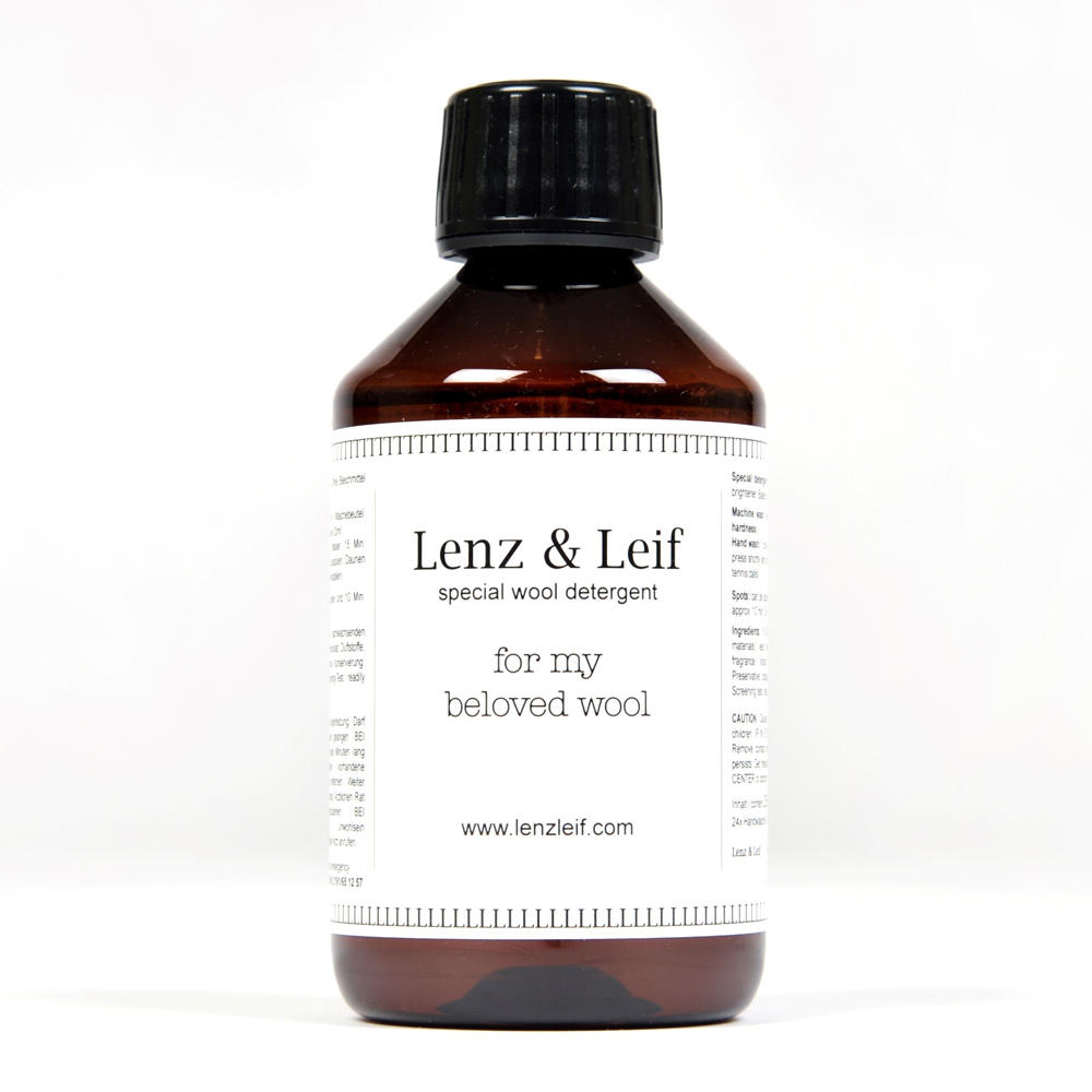 Per evitare di danneggiare la struttura fine della lana durante il lavaggio, Lenz & Leif ha fatto sviluppare un concentrato di detergente di alta qualità che si basa su ingredienti puramente naturali. Privo di agenti sbiancanti e sbiancanti, non solo protegge il tuo articolo preferito, ma anche l'ambiente allo stesso tempo.