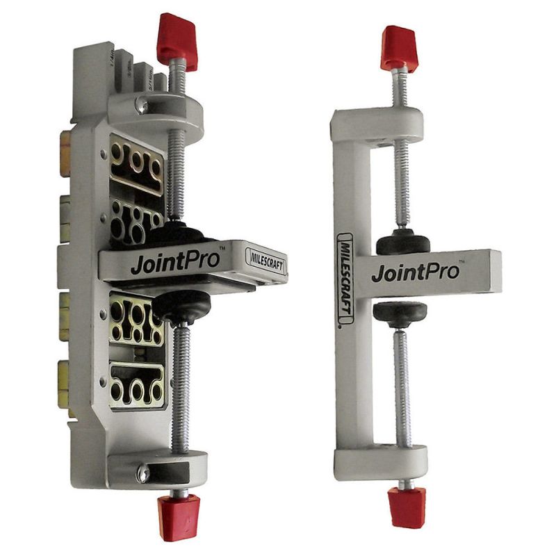 I blocchi per boccole intercambiabili in acciaio temprato permettono di praticare fino a sei fori per tasselli corrispondenti per ciascuna configurazione. Il dispositivo di autobloccaggio mantiene in maniera salda i pezzi in posizione. JointPro include due morsetti rimovibili che possono essere montati in posizione orizzontale o verticale. La guida per spinatura contiene feltrini antisdrucciolo che impediscono lo scivolamento prevenendo il danneggiamento del pezzo da lavorare. Per giunzioni ad angolo, a T e piatte. Per materiale con spessore da 12 a 38 mm. Blocchi per boccole con Ø 6, 8, 10 mm intercambiabili.