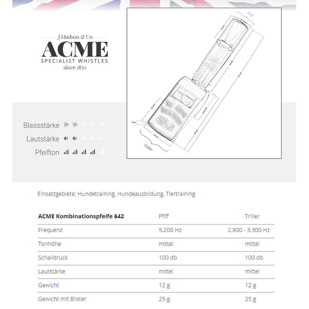 Da oltre 140 anni, l'azienda inglese ACME Whistles produce fischietti di alta qualità per ogni uso. Dal XIX secolo, si è investito molto nella ricerca e nello sviluppo, il che ha portato alla produzione di una grande varietà di fischietti come fischietti per cani, fischietti di segnalazione, fischietti e fischietti per arbitri nei design più diversi. Oggi, ACME è uno dei produttori di fischietti più conosciuti e più grandi del mondo. Un'ampia varietà di materiali vengono utilizzati e combinati tra loro, dando vita a fischietti di alta qualità, che a loro volta si riflettono nell'uso dei prodotti.