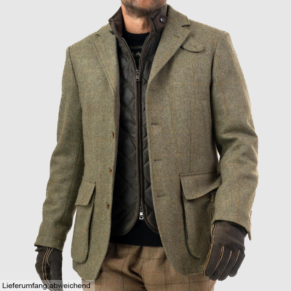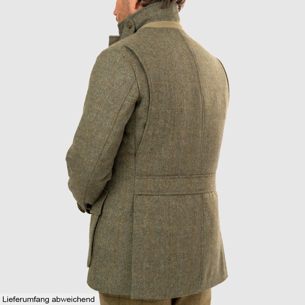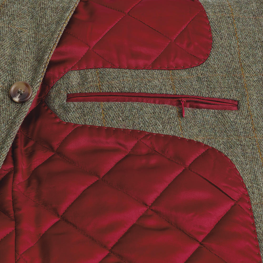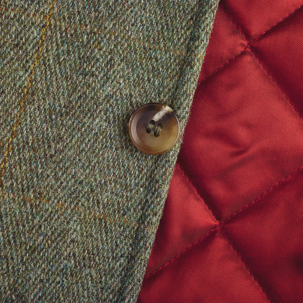 Le pieghe laterali nella zona delle spalle offrono un'ampia libertà di movimento. Altri dettagli complessi, come la patta antivento rimovibile, l’asola del colletto color cammello, la parte inferiore rossa delle patte, la cintura inserita in vita e gli spacchi laterali, sono degni di nota. Anche l'interno merita di essere menzionato: rosso acceso come la fodera trapuntata, sono anche le tasche interne con cerniera nelle ampie fodere in tweed. Due bottoni sulla fodera inferiore servono per riporre la patta antivento quando non viene utilizzata. La manica foderata è a strisce. La lunghezza del dorso per la taglia 50 è di 79 cm.
