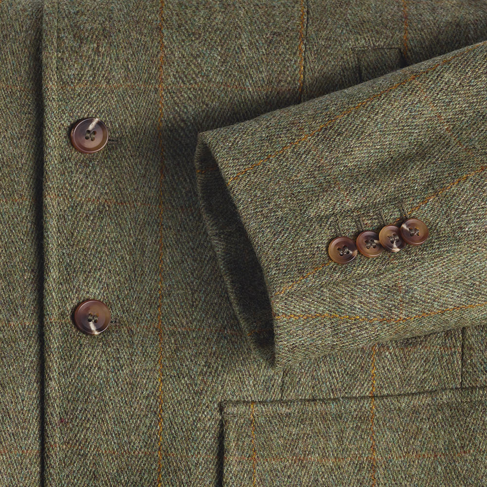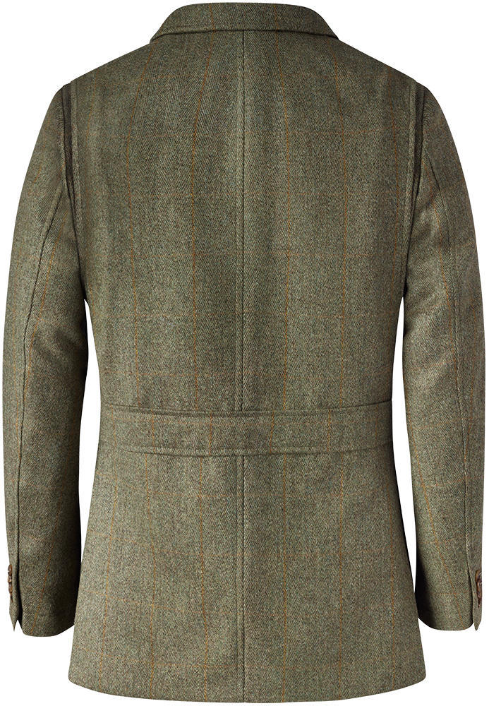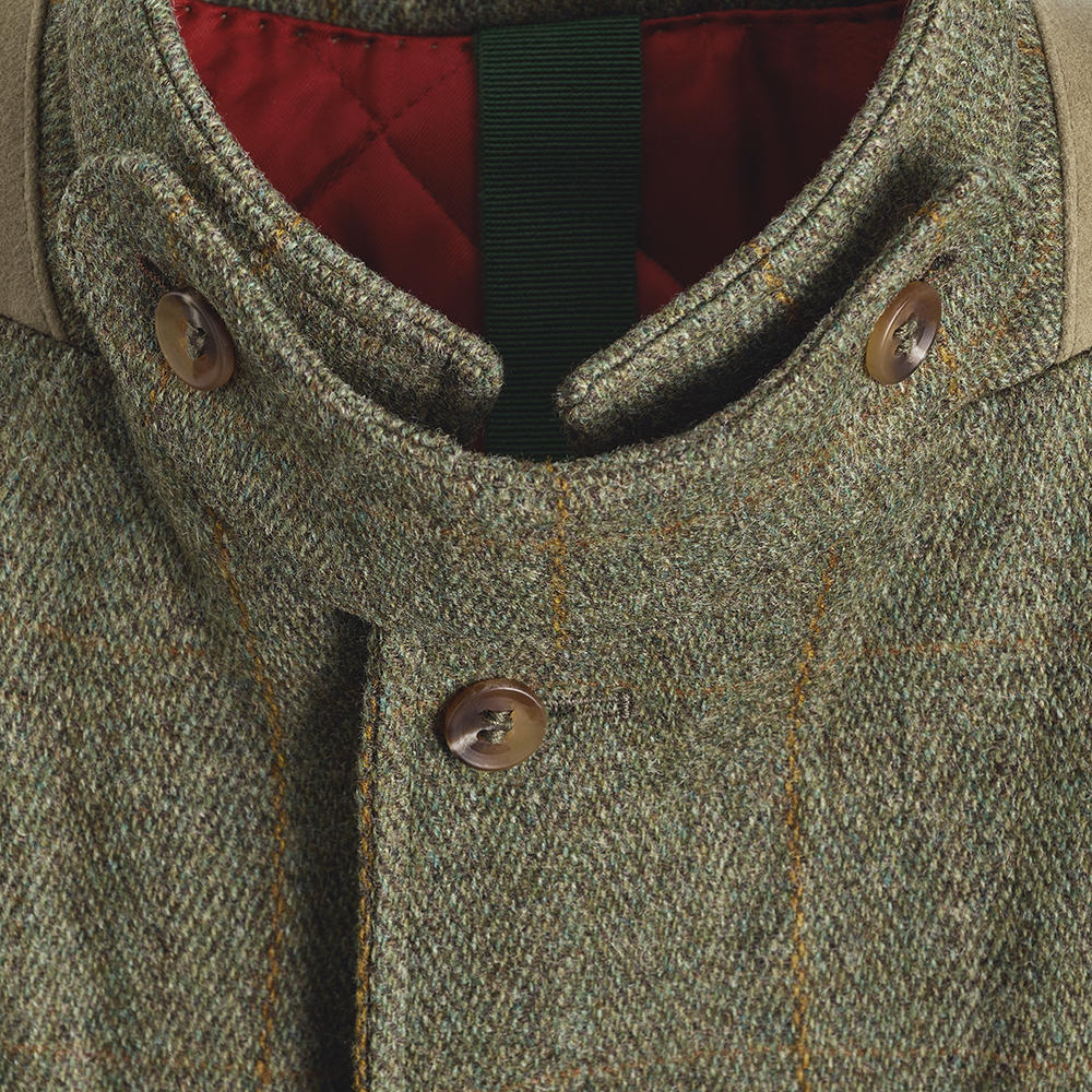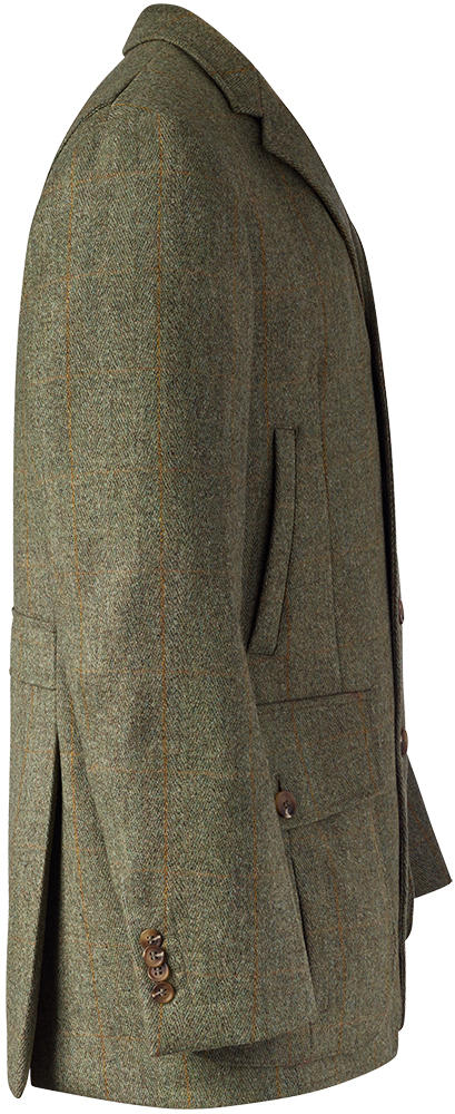 Le pieghe laterali nella zona delle spalle offrono un'ampia libertà di movimento. Altri dettagli complessi, come la patta antivento rimovibile, l’asola del colletto color cammello, la parte inferiore rossa delle patte, la cintura inserita in vita e gli spacchi laterali, sono degni di nota. Anche l'interno merita di essere menzionato: rosso acceso come la fodera trapuntata, sono anche le tasche interne con cerniera nelle ampie fodere in tweed. Due bottoni sulla fodera inferiore servono per riporre la patta antivento quando non viene utilizzata. La manica foderata è a strisce. La lunghezza del dorso per la taglia 50 è di 79 cm.