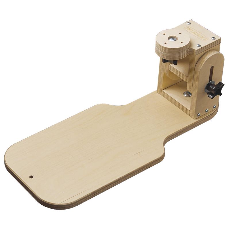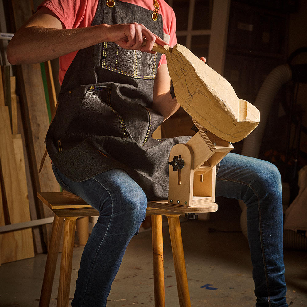 Questa morsa da scultore, realizzata in multistrato di betulla leggera e priva di deformazioni, può essere utilizzata ovunque ci sia un posto dove potersi sedere. Il peso del proprio corpo fissa la base su una sedia, uno sgabello o una panca. La posizione del pezzo può essere regolata a piacere in altezza, inclinazione e rotazione. Le tre viti con manopola a stella permettono di allineare la morsa in modo semplice e di bloccarla in tutta sicurezza. Consegnata smontato, con istruzioni di montaggio. Base 570 x 240 mm, altezza 195 - 270 mm.