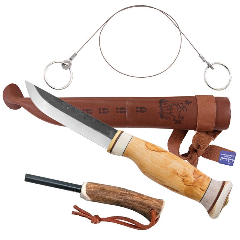 - Coltello da caccia e da esterno multiuso di Wood Jewel, con passante per cintura incluso nella consegna. Il manico è una combinazione di betulla nordica venata e corno di renna, la lama è realizzata in acciaio al carbonio 80CrV2 con crosta di forgiatura nera. Non inossidabile, durezza 58 HRC.