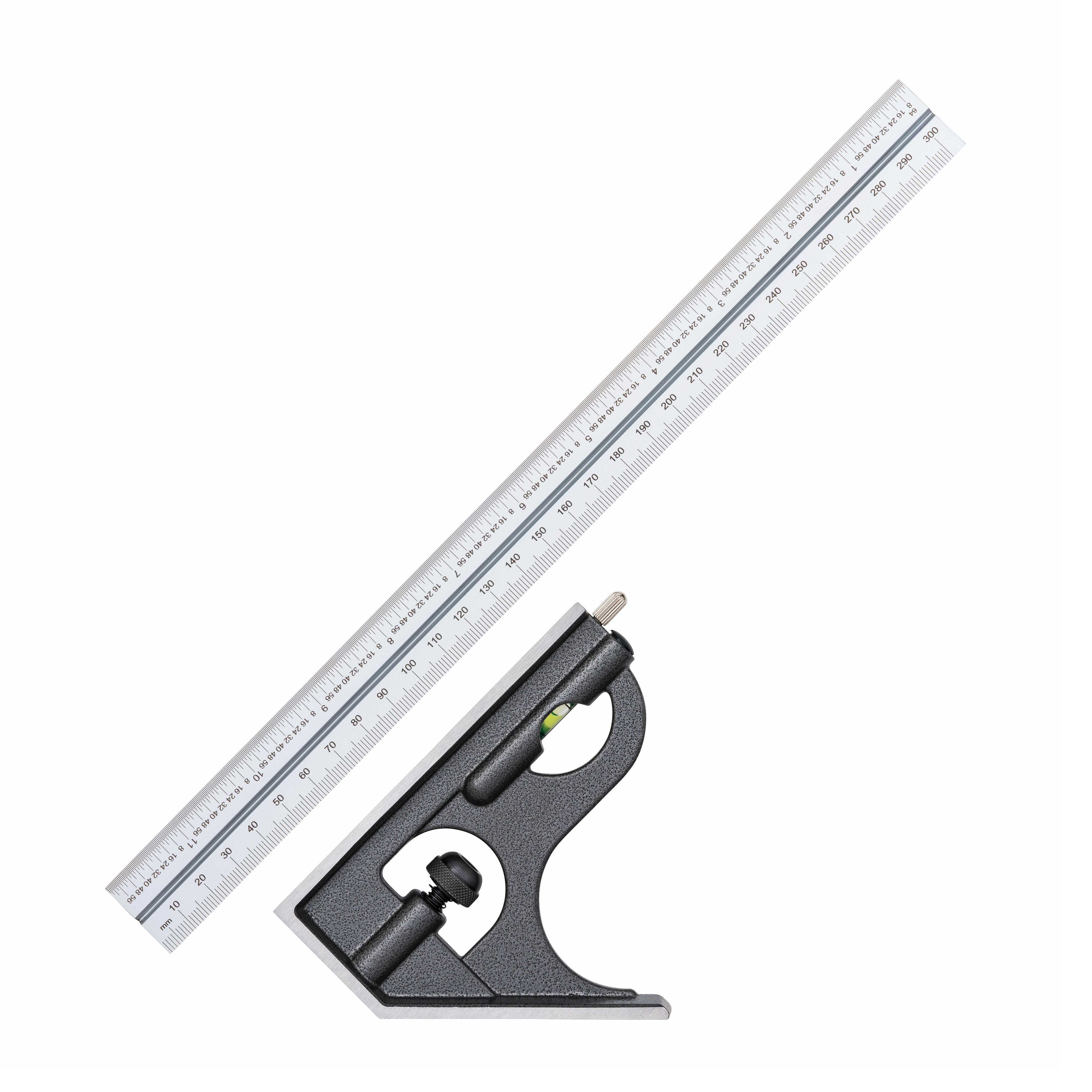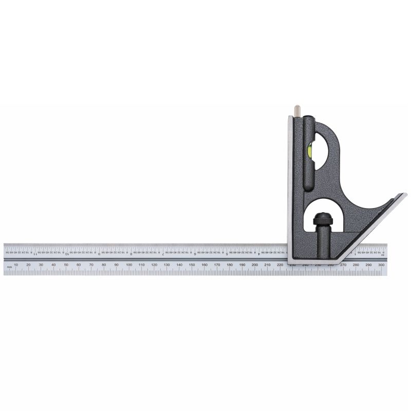 Kombiwinkel mit 45°/90°-Kopf, integrierter Anreißnadel und Wasserwaage für gängige Anreiß- und Prüfarbeiten.