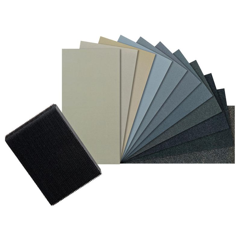Je ein kletthaftendes Blatt der Körnungen 1000, 1500, 1800, 2400, 3200, 3600, 4000, 6000, 7000, 8000, 12000, Schleifblock aus Schaumgummi mit Klettbeschichtung.
