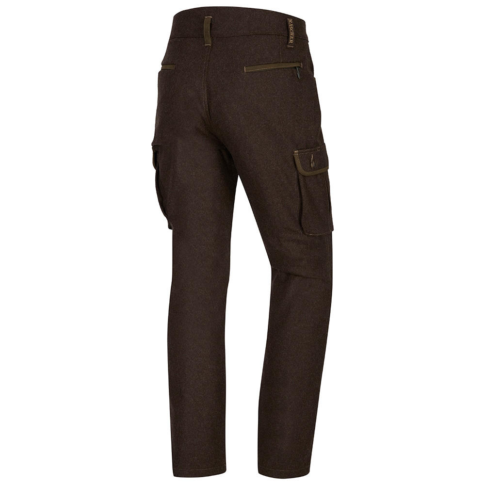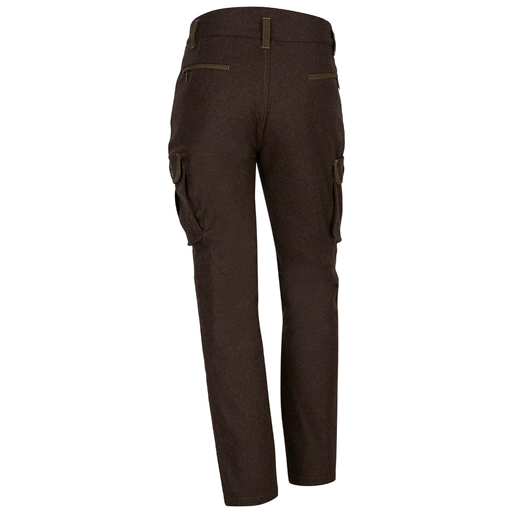 Die durchdachte Gestaltung der Hose zeigt sich in den vielseitigen Taschenlösungen. Ausgestattet ist sie mit zwei großzügig bemessenen Vordertaschen, einer Gesäßtasche mit Reißverschluss und einer Messertasche auf der rechten Seite. Beintaschen rechts und links, die sich einfach per Knopf verschließen lassen, bieten zusätzlichen Raum für wichtige Jagdutensilien. Die breiten Gürtelschlaufen bieten Platz für einen robusten Gürtel.