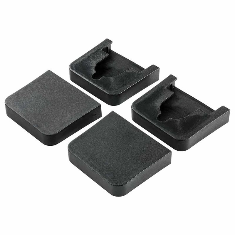 Zwei Paar Schutzkappen zum Aufstecken auf die Druckplatten der Pony Pipe Spannelemente. Sie schützen die Holzkanten vor Druckstellen und verhindern das Anhaften von Leimkrusten.